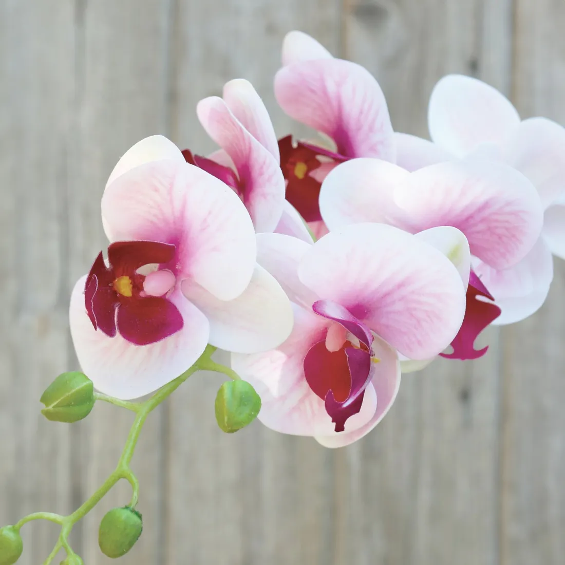 Très jolie orchidée artificielle grande taille. Fabriquée en tissu polyester, elle possède un touché doux naturel. Si le fond des fleurs est blanc, une nuance rose tendance a été ajoutée sur chaque pétale pour lui donner un aspect déco moderne. Le cœur rose de même ton est plus soutenu. La tige vert clair s'accorde à merveille avec la couleur des fleurons. Cette fausse orchidée ajoute une note fraiche dans la décoration intérieure. Moins classique que la phalaenopsis blanche, ce coloris pastel se laisse remarquer sans être trop présent. Vous pourrez réaliser des compositions florales artificielles qui s'associeront avec des teintes bleue, verte, violette, rose et toutes les nuances de gris. L'orchidée de belle dimension est idéale pour les espaces professionnels, les chambres ou les salons.