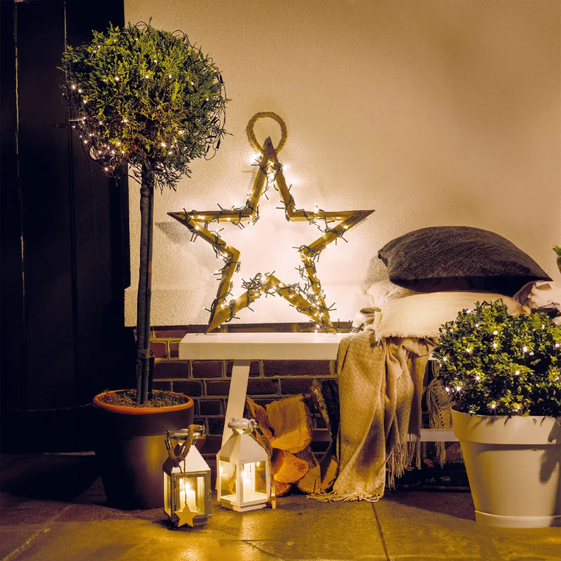 C'est une guirlande lumineuse compacte composée de leds. elle peut être exposée en intérieur ou en extérieur. Elle est parfaite pour faire scintiller un sapin artificiel de H150cm à H210cm. Le câble vert se fait très discret parmi les aiguilles. Vous pourrez choisir la vitesse et l'effet de clignotement des ampoules. Leur couleur blanc chaud donne une tonalité chaleureuse à la décoration. Mais cette guirlande électrique a bien d'autres atouts. Dehors elle vous permet d'ajouter une note festive sur votre balcon ou votre terrasse. Vous pourrez la suspendre à une pergola, l'accrocher sur un bord de fenêtre ou une balustrade à la place des lumignons lyonnais lors du 8 décembre par exemple. Dedans, elle décore une chambre, illumine un mur, rend un meuble éclatant ou fait chatoyer un rideau. La période de Noël n'est pas la seule saison propice aux créations d'ambiance.