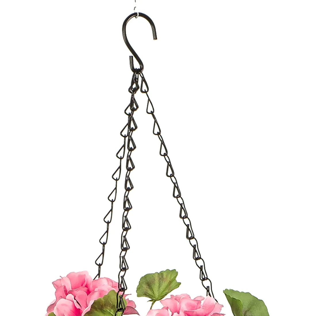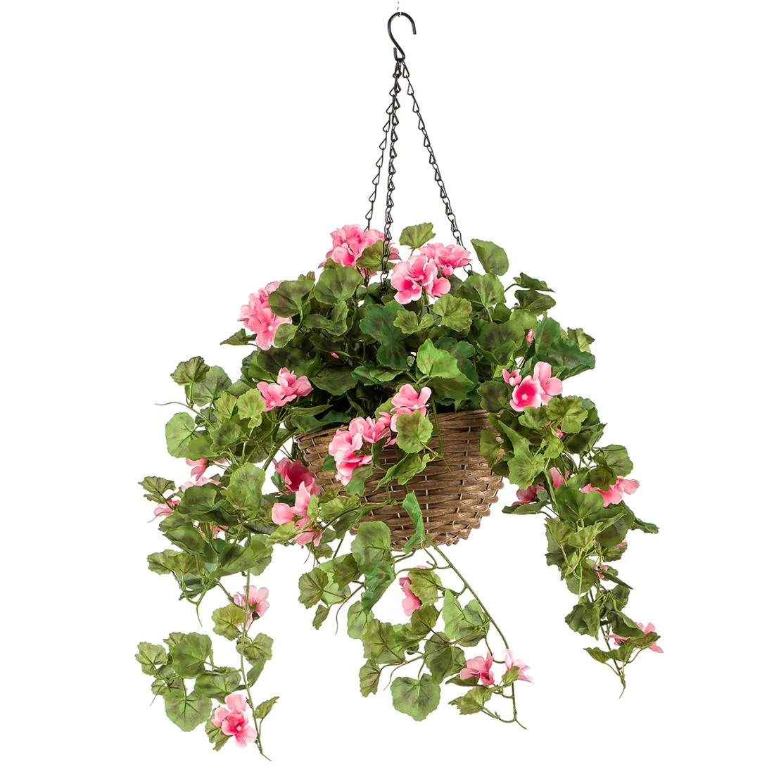 Modèle de Géranium artificiel mesurant 75 cm de hauteur totale pour une envergure d’environ 60 cm, coloris rose. Cette variété est conçue pour résister dehors. En matière tergal (tissu). Fleurs réparties sur l'ensemble de la composition et de belles feuilles synthétiques en tissu de plusieurs dimensions . La plante à fleurs est fixée dans un panier en rotin de 24 cm de diamètre et 14 cm de hauteur. Cette plante artificielle fleurie est munie du système d'accroche pour suspendre comme sur la photo, crochet également fourni.