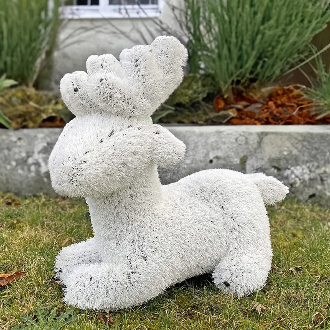 Animal du grand nord par excellence, ce renne a revêtu un pelage hivernal blanc. Il s'accorde aux frimas et à la décoration d'automne et d'hiver. Son habit blanc ressort bien sur un fond sombre comme un lit de feuilles sèches ou devant un massif d'arbustes caduques. Il est également adapté à la décoration des fêtes de Noël dans le jardin mais aussi à l'intérieur de la maison. Il amène un coté festif et sympathique. Ce joli renne couché sur ses pattes fera sourire petits et grands. Il sera à son aise à coté du sapin, attention toutefois de ne pas le positionner trop près d'une source de chaleur chaude comme un poêle ou une cheminée.