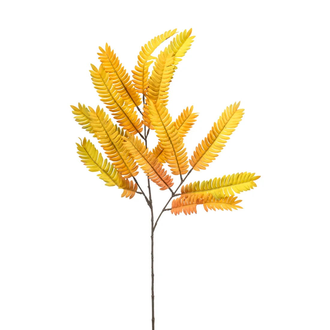 Le Cojoba s'apparente à du mimosa, mais version plus tropicale. La branche est constituée de nombreux folioles dans un style pennée (plume d'oiseau). Les petites feuilles sont un importantes que celles du mimosa que l'on connait. Même si nous sommes sur une imitation de vraie plante, l'intérêt de ce feuillage réside surtout dans sa couleur qui le rend particulièrement décoratif. Le coloris chaud orangé tire sur le ton rouille vif. Il est parfait pour faire rentrer l'automne dans la maison; mais son utilisation dépasse largement cette saison. Pour les thèmes de couleur, il décore à merveille la table, ou un support. Pour l'originalité et le coté vitaminé glissez la branche dans un vase. Pour créer un bouquet éclatant de coloris et peu banal, osez le mélange avec des feuilles ou des fleurs violettes, or, ou jaune. L'ensemble donnera du style à une pièce un peu trop impersonnelle. C'est l'esprit idéal pour un hall d'accueil, un salon, une salle d'attente.