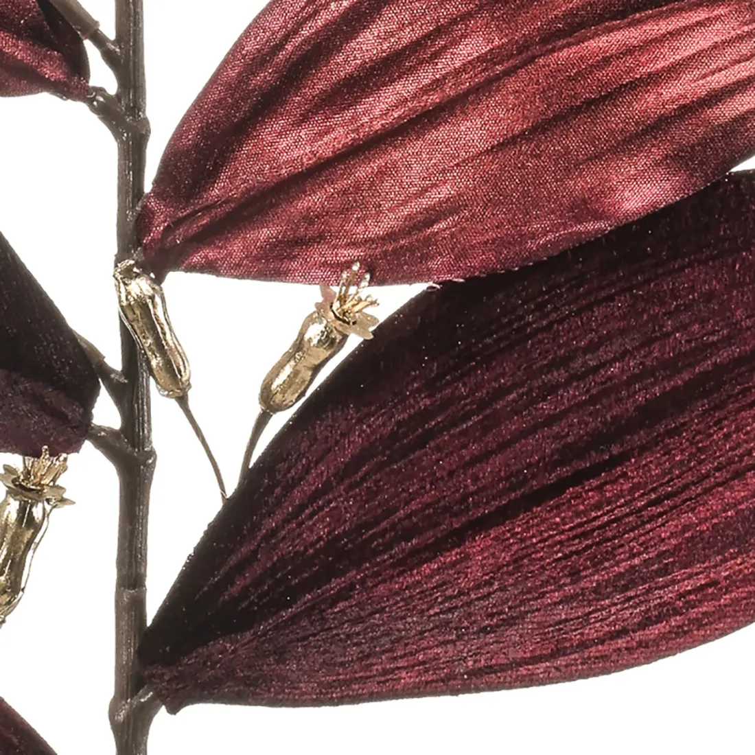 Le Sceau de Salomon est une plante naturelle que l'on trouve dans les bois, ainsi que dans nos espaces verts, aux côtés d'autres végétaux de la même famille, comme les Hostas, les plant de Muguet, les Muscaris ou les Jacinthes. Cette fausse branche de Polygonatum présente un feuillage penné disposé de part et d'autre de la tige. Les feuilles ont une forme et un aspect réalistes, à l'exception de leur teinte satinée rouge violacé, qui rend le feuillage volontairement singulier et décoratif. Cela permet des créations de compositions florales artificielles originales. Cette tige factice est adaptée pour des événements à thème coloré et peut également amener une ambiance chaleureuse dans un espace un peu froid. Le bourgogne se marie avec des tons blancs, crème, gris, verts et rose, pour un effet agréable.