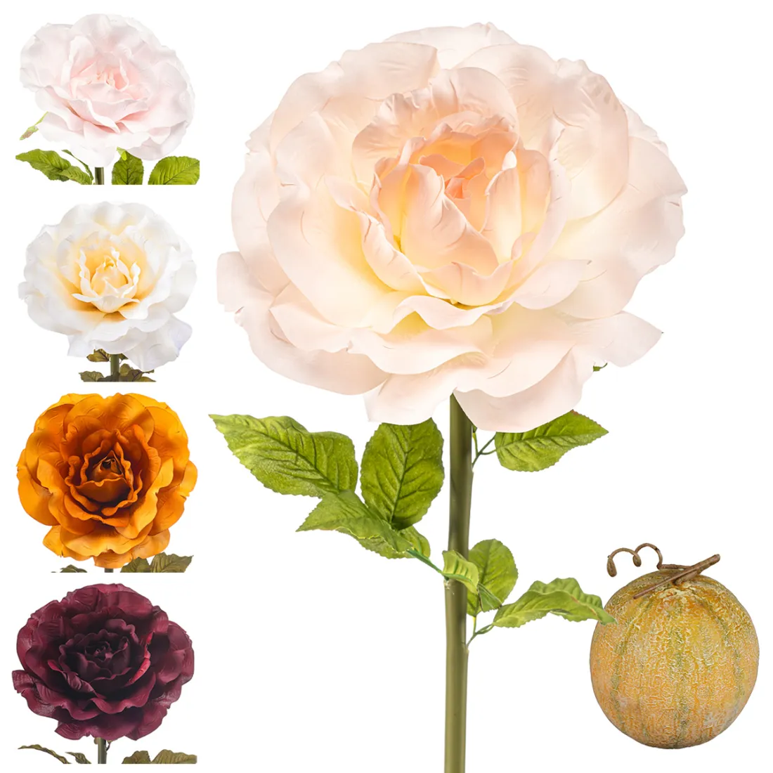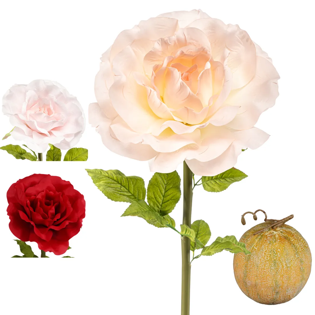 Fabriquée en tissu polyester, cette fausse rose de grande envergure est qualitative et parfaite pour la décoration de la maison, mais aussi pour les lieux professionnels tels qu'un hall d'accueil, une vitrine, le bureau ou la personnalisation d'un showroom. La fleur artificielle hors norme, fera sensation glissée dans un vase haut lesté, posé à même le sol. Elle peut également garnir un mur ou servir pour la mise en scène d'un évènement à thème. Pour la composition d'un bouquet vous pouvez lui associer un gerbera et une pivoine de gabarit semblable. Les 3 espèces sont déclinées dans des coloris identiques qui peuvent s'associer sans faute de goût.