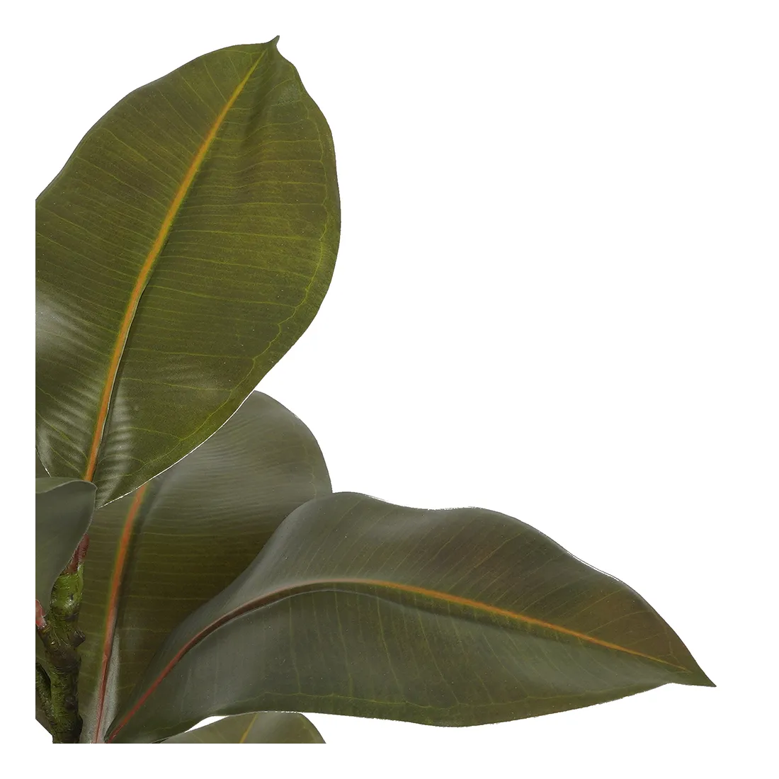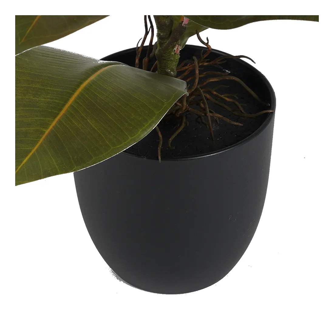 Petit Ficus artificiel Elastica ou Rubber Plant composé d'un pot en PVC et d'un feuillage en polyéthylène.