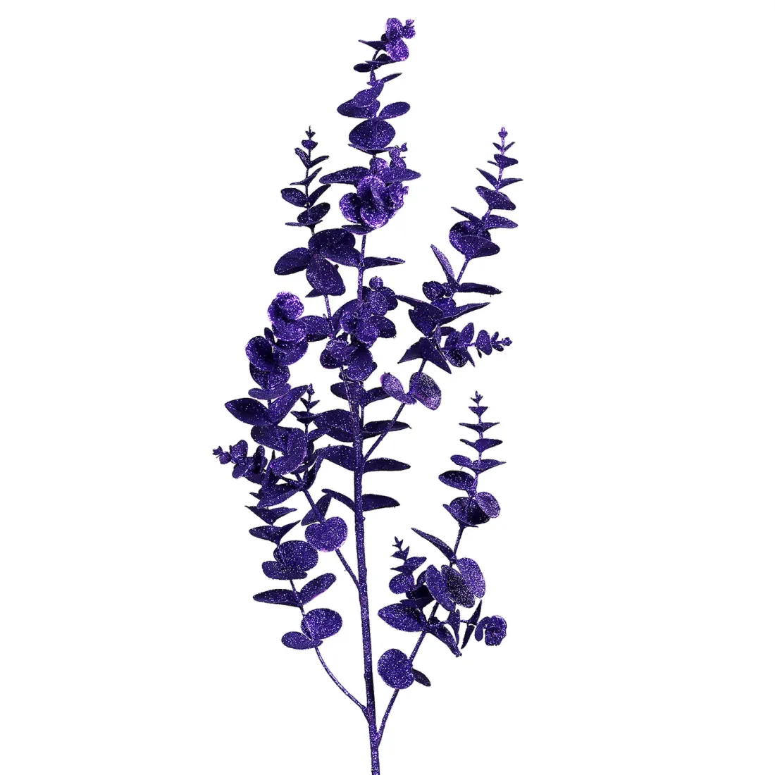 C'est une branche d'eucalyptus d'une jolie teinte violette. Elle est adaptée aux fêtes de fin d'année pour agrémenter une décoration funky ou un thème mélangé de rose et de pourpre. Son aspect légèrement pailleté lui permet aussi d'être utilisée en toute saison, il amène un coté pétillant aux bouquets d'intérieur et aux compositions d'évènements spéciaux comme les mariages, les baby showers, les soirées ou les anniversaires. Les fleurs artificielles blanches font merveille en association. Le ton vert vif ou les styles irisés apportent leur ambiance très déco.