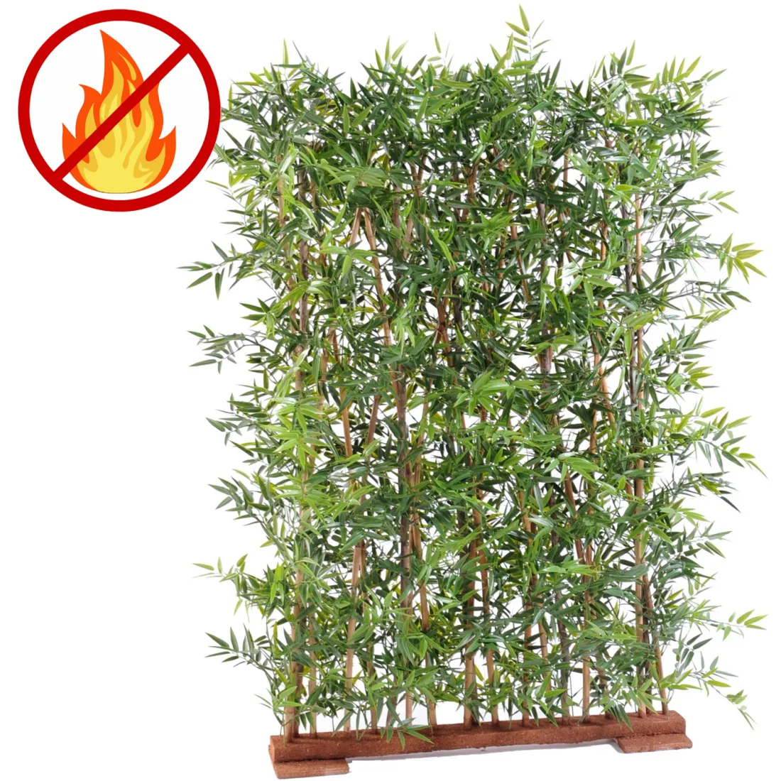 Haie bambou artificiel japonais, ignifugée, composée de 19 cannes de bambou naturel et d'un feuillage vert en Polyéthylène (plastique). Hauteur 150 cm pour 110 cm de longueur et 45 cm de largeur. Livré en un seul morceau, les cannes sont fixées sur un socle de 90 cm de longueur par 18 cm de largeur. (plantes artificielles)
