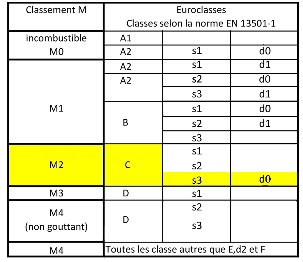 Ce produit a obtenu selon la norme européenne EN 13501-1 :2018 un classement C-s3,d0, équivalent M2 ( le produit est difficilement inflammable)