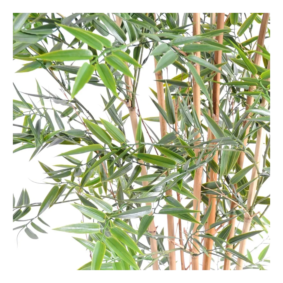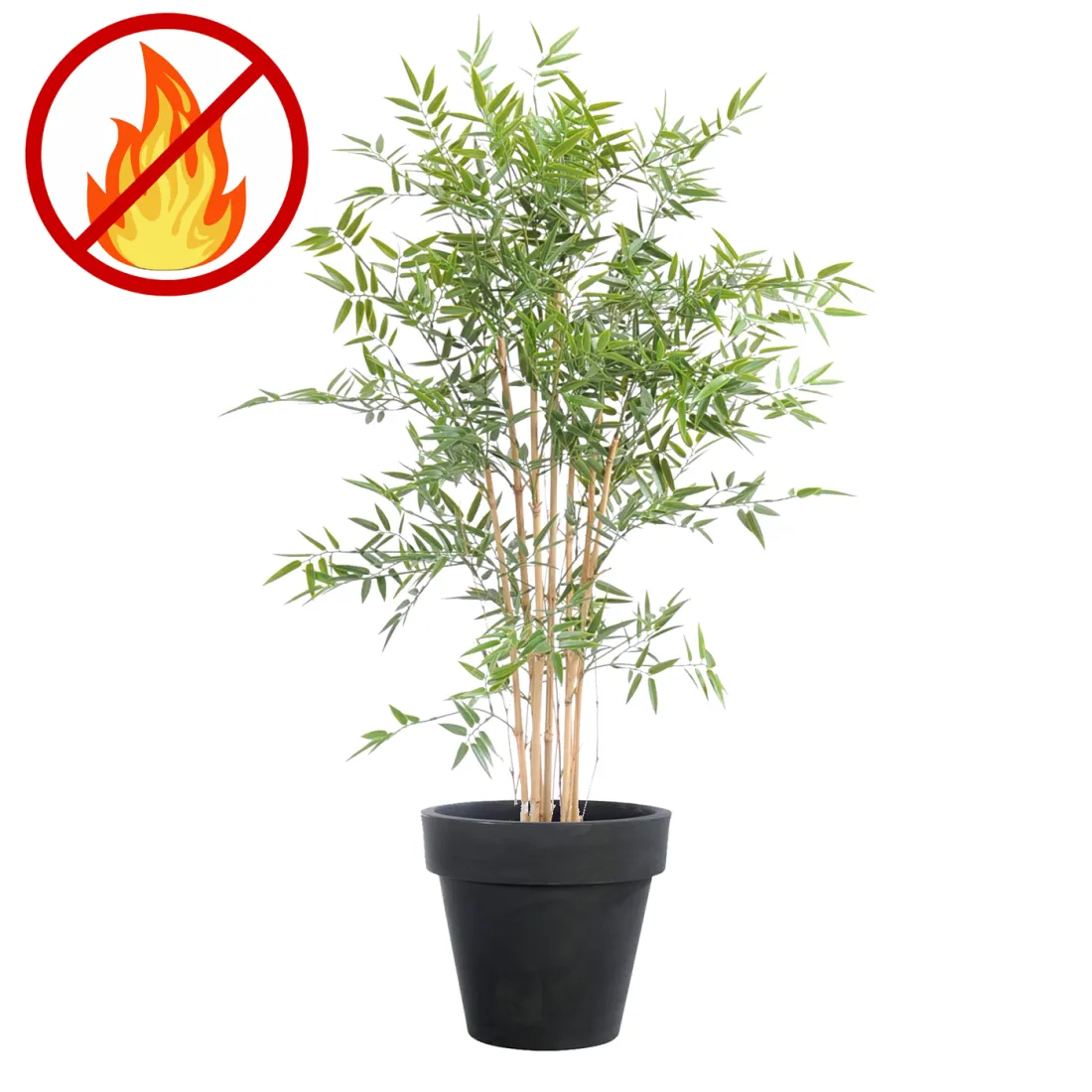 Ce bambou artificiel grandes feuilles est ignifugé et composé de 6 cannes de bambou naturel. Le feuillage synthétique est vert en matière tergal. Les feuilles font 15 cm de longueur par 2.5 cm de largeur pour les plus grandes. 3 dimensions sont proposées pour l'arbre artificiel; de 120 à 180 cm de hauteur. Livré dans un support plastique destiné à être inséré dans un autre contenant plus décoratif (plantes artificielles). Le feuillage est dense.