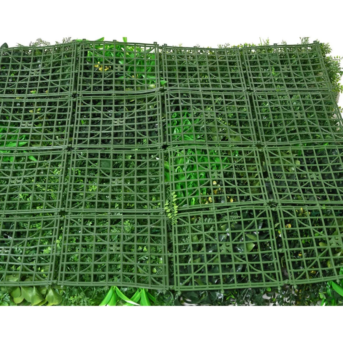 Ce mur végétal artificiel ignifugé est composé de 16 petites plaques carrées souples de 25 cm x 25 cm clipsées. Elle mesure 100 cm de côtés par 100 cm de largeur. Couleurs des plantes associées jaune, blanc, violet, vert clair et vert foncé. Prévoir environ 10cm de chevauchement entre 2 plaques lorsque vous attachez les carrés entre eux.