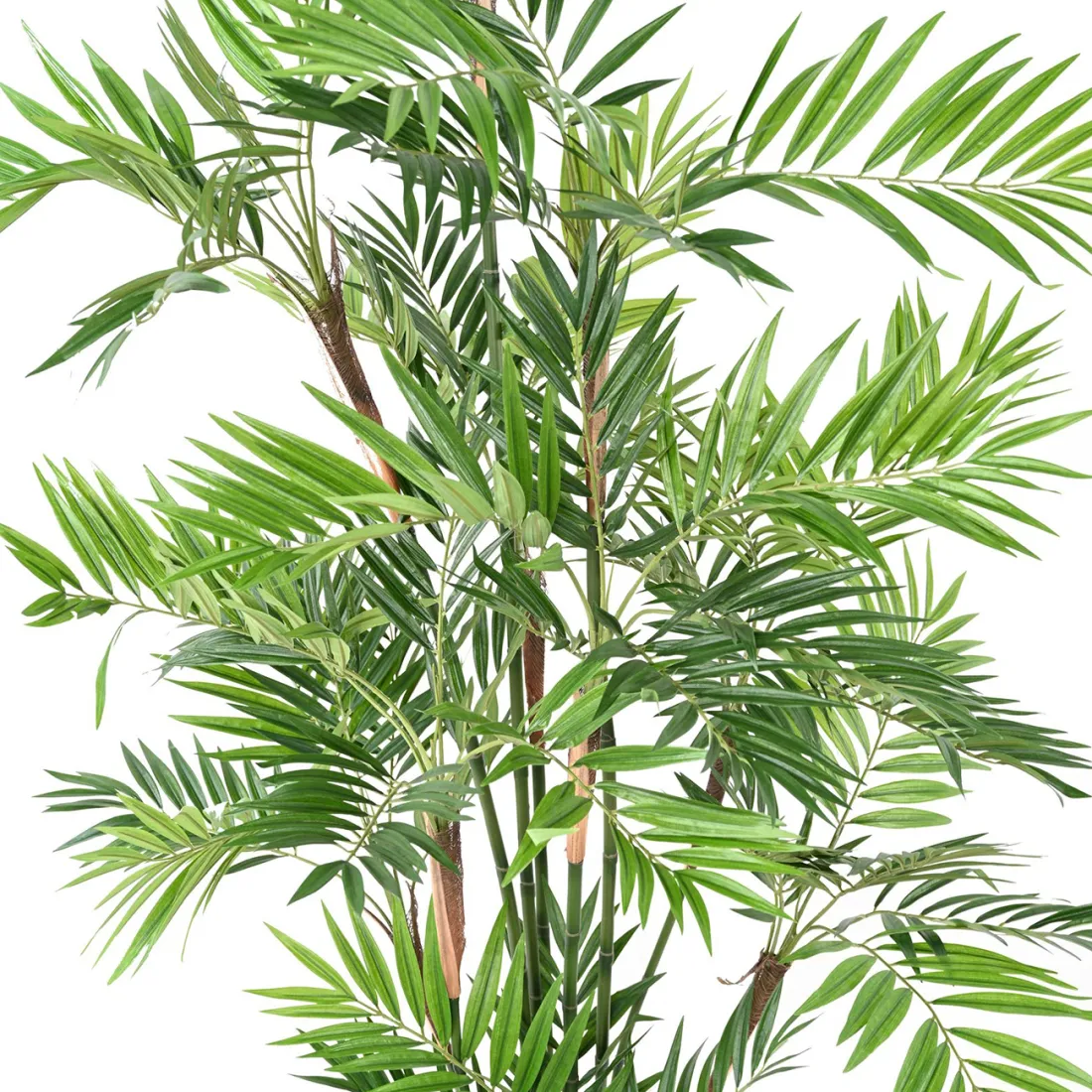 Ce faux palmier est conçu à partir de faux troncs sous forme de tiges dont certaines agrémentées de fibre naturelle. Le feuillage est en tissu tergal. La plante artificielle est vendue dans un support de plantation, sa taille est comprise du sol jusqu'au sommet des feuilles. Le parlour artificiel est de bonne qualité et réaliste. Il ne nécessite aucun entretien particulier et possède une longue durée de vie. Peu envahissant, il est parfait pour orner un angle de pièce dans un bureau ou dans une salle de repos par exemple. Son caractère ignifugé lui permet d'être installé en ERP ou dans un espace recevant du public.