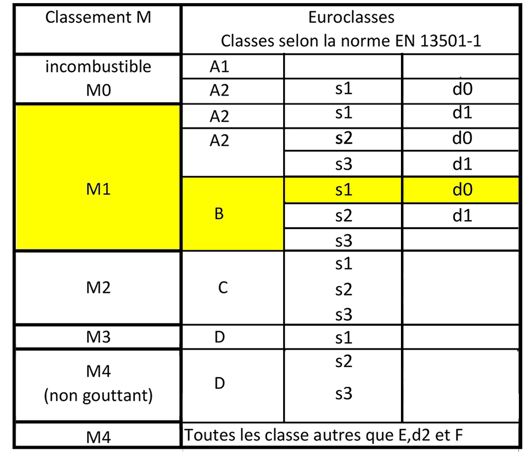 Ce produit a obtenu selon la norme européenne EN 13501-1 :2018 un classement B-s1,d0, équivalent M1 ( le produit est combustible, mais non inflammable)
