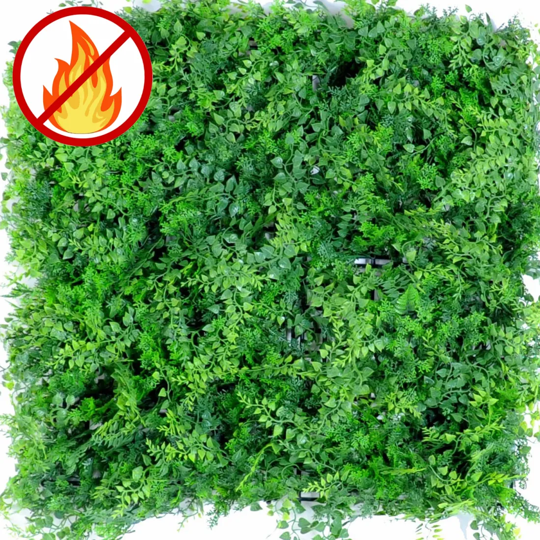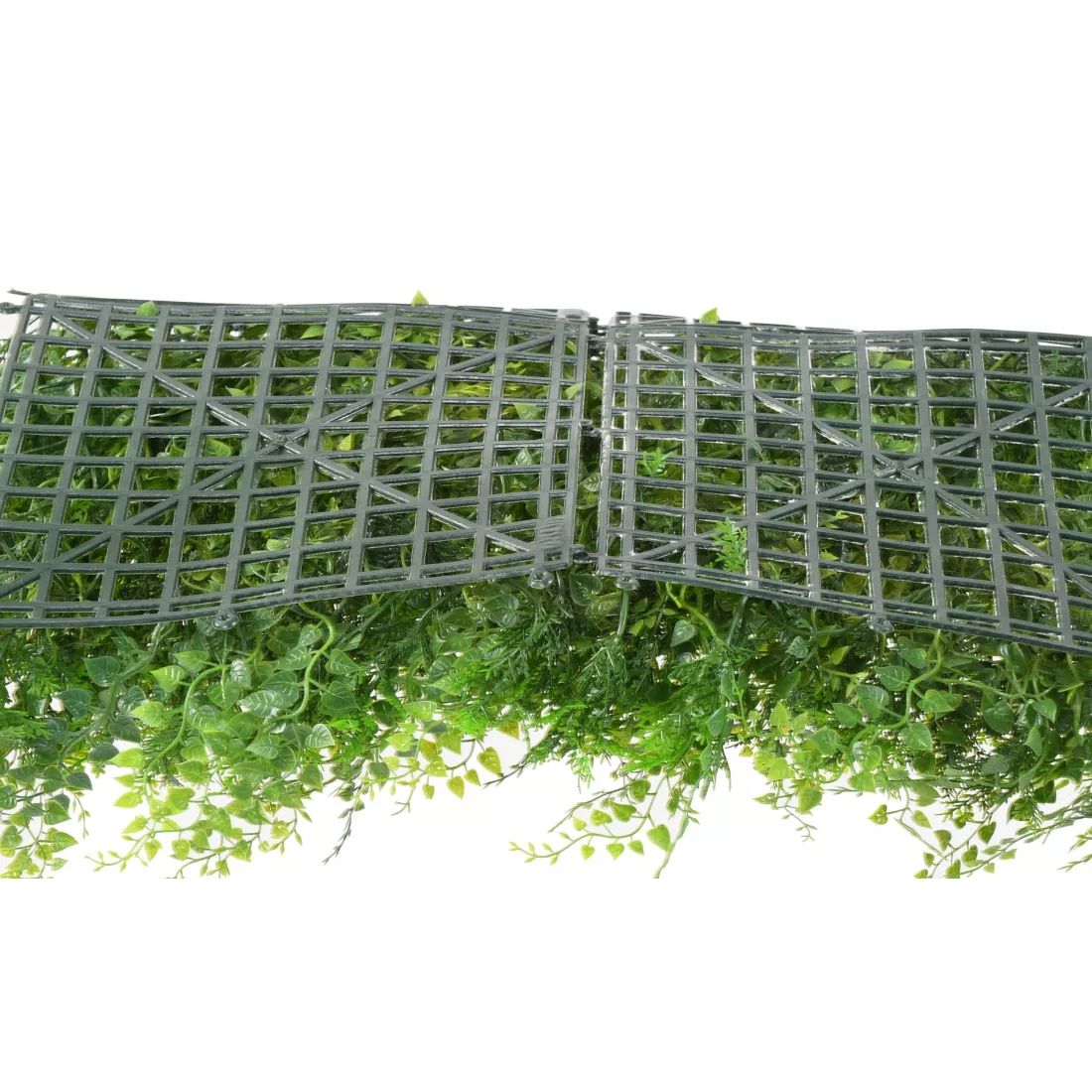 Ce mur végétal artificiel ignifugé est composé de 4 plaques carrées souples de 25 cm x 25 cm clipsé. Elle mesure au total 50 cm de cotés par 50 cm de largeur. Feuillage artificiel en polyéthylène (plastique). Prévoir 5 à 10cm de recouvrement d'emboitage entre chaque plaque.
