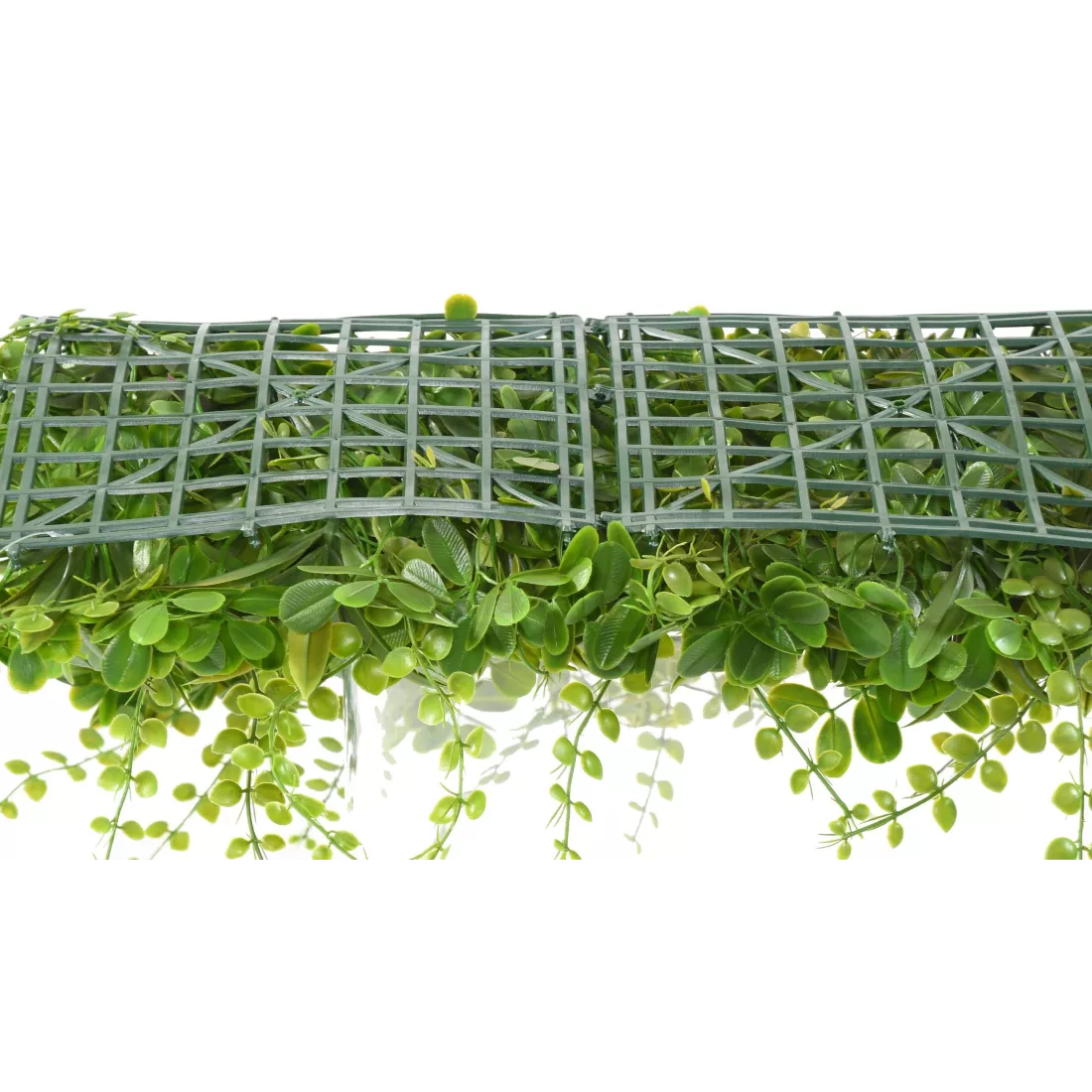 Ce mur végétal artificiel, traité anti feu, est composé de 4 plaques carré souple de 25 cm x 25 cm clipsé, elle mesure 50 cm de cotés par 50 cm de largeur. Feuillage artificiel en polyéthylène (plastique) plaque clipsable les unes entre les autres