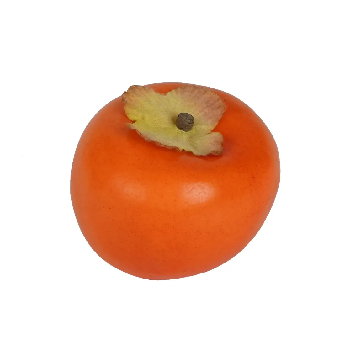 Joli fruit artificiel de Kaki d'un orange très ressemblant au coloris naturel à maturité. L'aspect de la peau est lisse et légèrement brillant comme le vrai plaquemine ou figue caque. Deux autres désignations pour un fruit originaire d'Asie devenu assez courant en Europe du sud. Tel un fruit ramassé sur l'arbre, notre kaki factice possède des petites feuilles en tissu, esprit séché. Vous pourrez créer de belles compositions fruitières ou légumières en piochant parmi nos nombreuses variétés. Nos imitations de fruits sont idéales pour mettre en valeur une cuisine mais aussi pour agrémenter des magasins de professionnels du jus de fruits. Pour accrocher le kaki sur un arrangement végétal, il est possible de le percer.