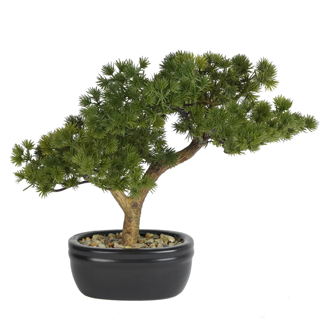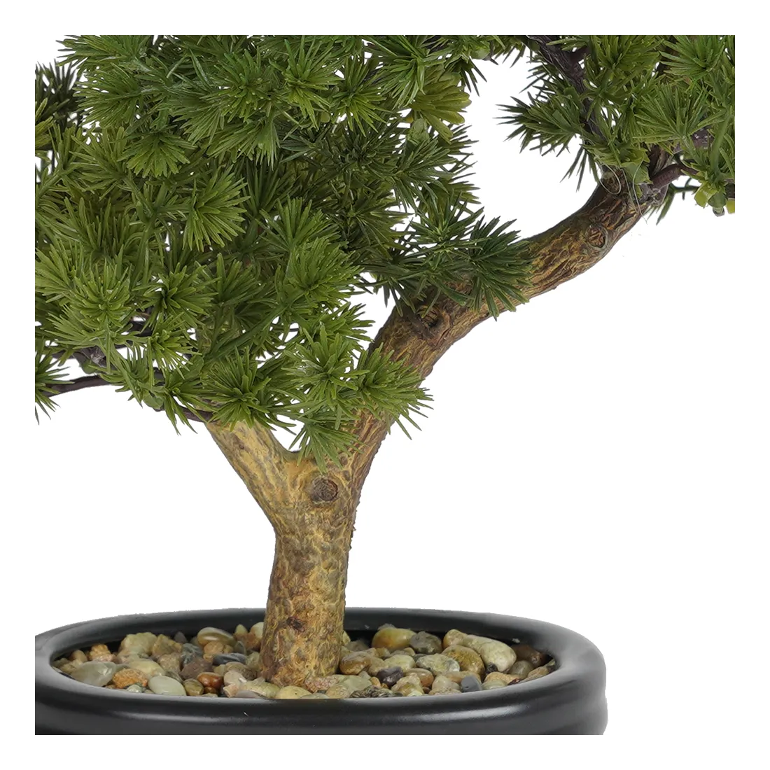 Bonsaï artificiel pin de 43 cm de hauteur, présenté en coupe PVC marron et surfaçage en petits galets.