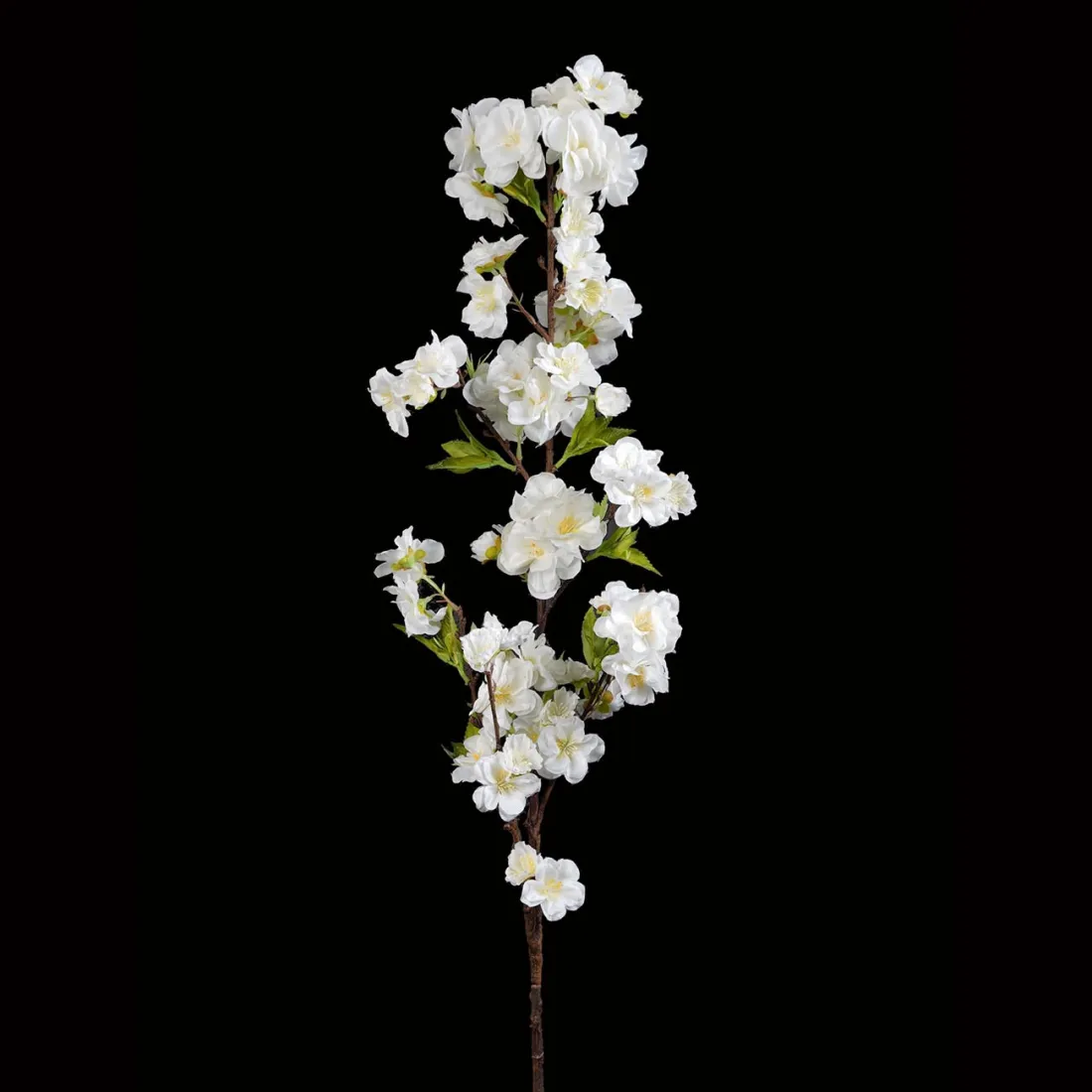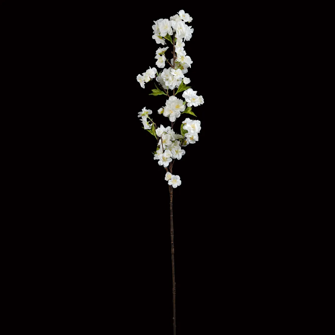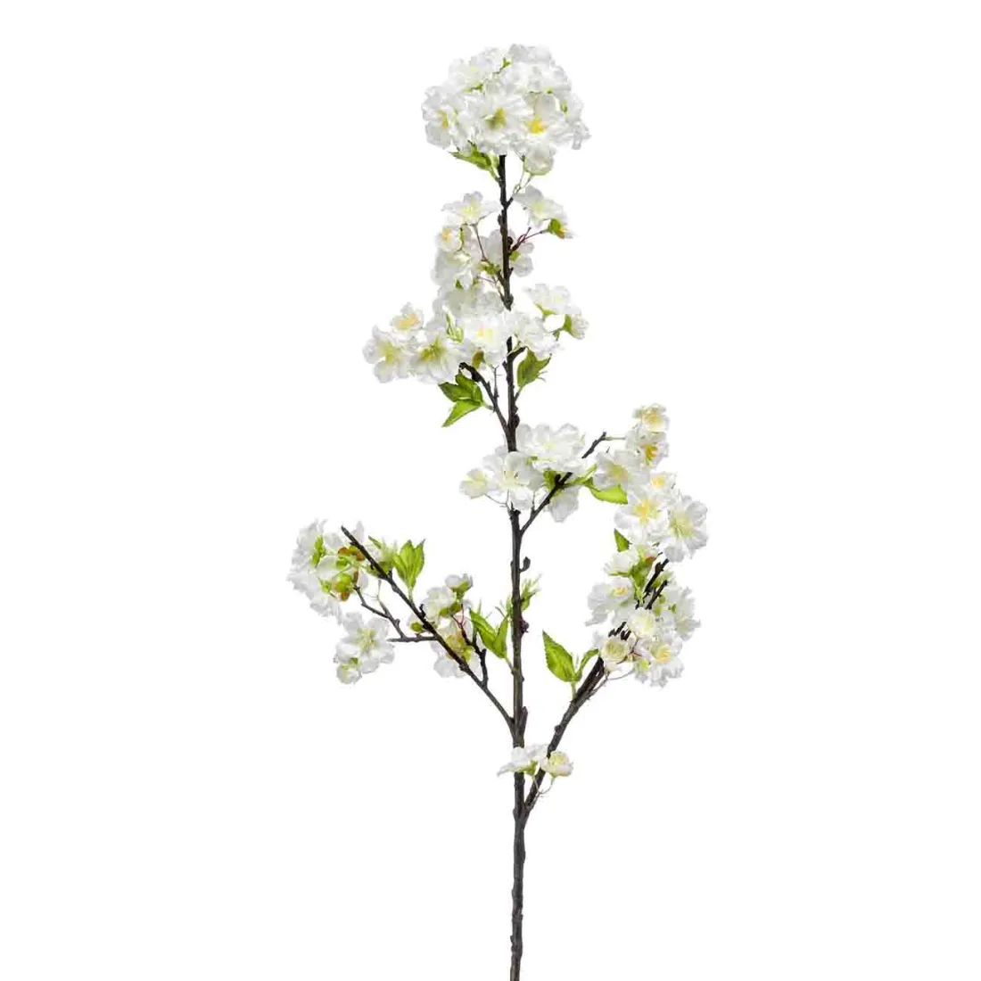 Branche de cerisier artificielle composée de fleurs et feuillages en tissu polyester, Tergal. Elle mesure 92 cm de hauteur pour une largeur de 30 cm.