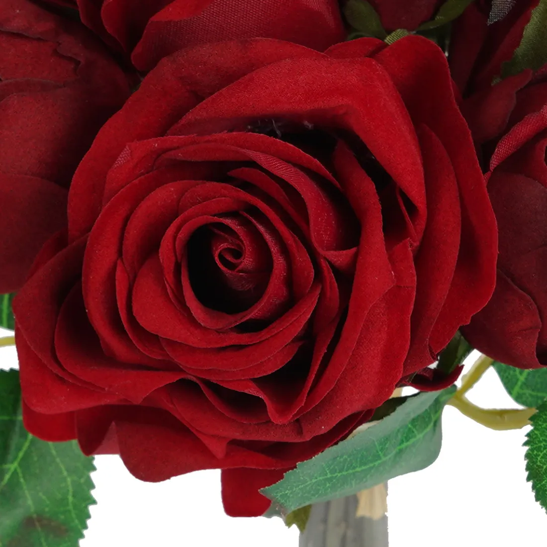 Ce magnifique bouquet de roses rouges artificielles est une véritable réussite. Les fleurs, de tailles et de stades d’épanouissement différents, affichent de superbes nuances de rouge. Certaines se rapprochent du rouge sang, tandis que d’autres tirent subtilement vers le pourpre. Le faux bouquet est formé de 8 roses de gabarits variés ce qui lui confère un aspect de fleurs naturelles. La matière tissu velours le rend doux au toucher et somptueusement élégant à contempler. Pour apporter encore plus de chic à la déco intérieure, pensez à la petite guirlande lumineuse micro led spéciale bouquet alimentée avec des piles.