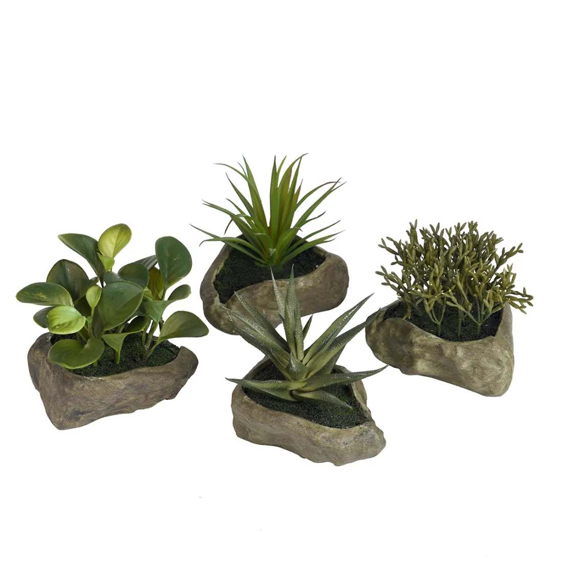 La taille de ces succulentes les place dans la catégorie de mini plantes vertes artificielles. Vous avez la possibilité de choisir chaque modèle individuellement ou de les assortir pour créer un effet de masse encore plus harmonieux et esthétique. Avec leur belle imitation et leur finition soignée, ces fausses plantes grasses rappellent fidèlement l’apparence des succulentes naturelles. Tous les petites plantes sont hétérogènes et possèdent des feuillages très différents. les pots, dont la forme irrégulière rappelle un galet caillou difforme, se démarquent par leur forme originale et leur aspect intrigant. Les petites ensembles de succulentes décorent les intérieurs et s'intègrent dans des mises en scène plus professionnelles. Posez les sur une étagère, une table, une échelle de plantes, un comptoir, un stand de marché artisanal ou une vitrine de magasin. Leur joli réalisme et leur allure contemporaine ajoutent une note moderne à votre décoration, tout en étant d’une praticité évidente. Sans entretien, elles offrent une verdure durable et intemporelle, idéale pour tous vos espaces, du plus cosy au plus stylé.