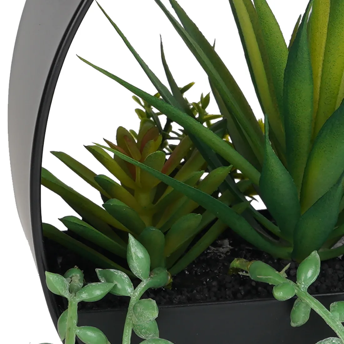 Cette composition de fausses succulentes est tout à fait charmante présentée dans un pot au design contemporain. L'ensemble bien proportionné n'est pas envahissant, ce qui lui permet d'être placé facilement dans vos espaces; aussi bien sur du mobilier que sur une étagère ou une banque d'accueil. L'arrangement comprend 5 variétés de mini plantes artificielles: 2 choux, un Aloé, une Crassula retombante et 1 Echeveria "micro" choux. Les fausses succulentes sont fixées dans un support polystyrène recouvert d'un aspect terre. Le pot de forme universelle ronde, porte une symbolique forte associée à la douceur et l'harmonie. Les arrondis atténuent les perceptions et apportent une sensation de convivialité et de sérénité.