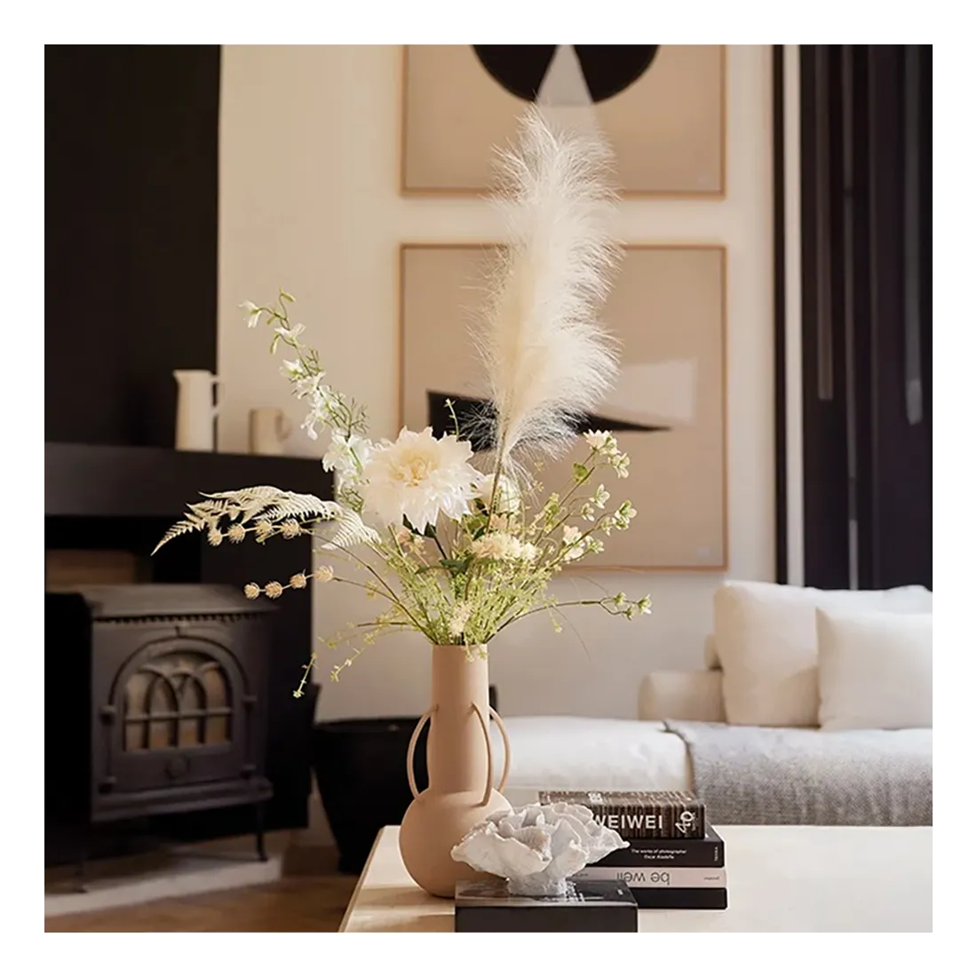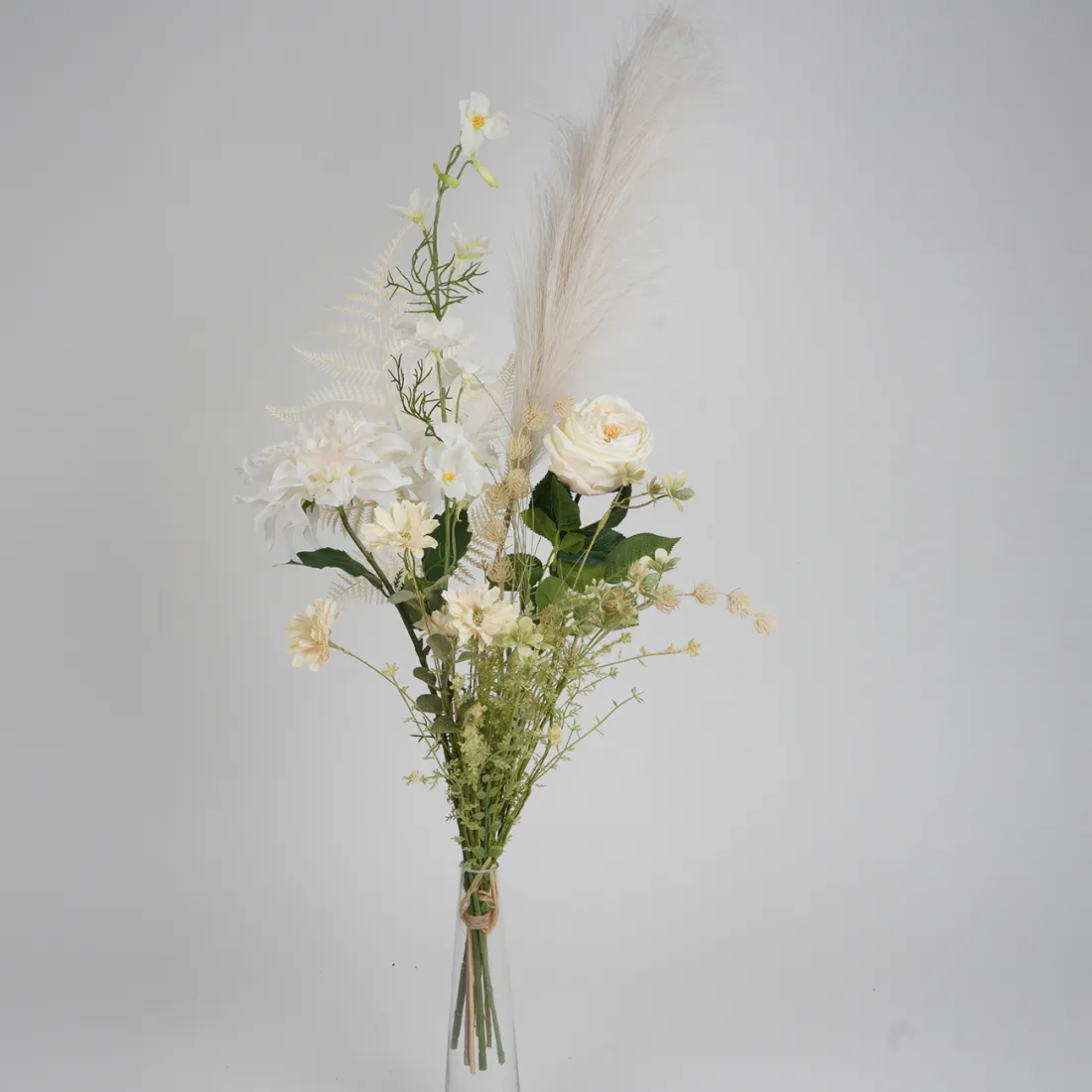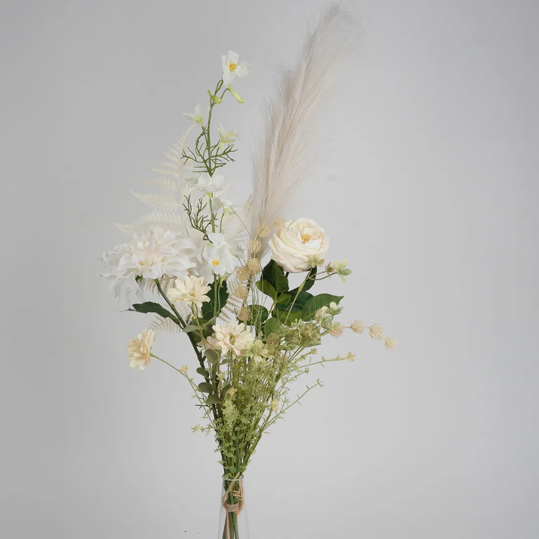 Ce bouquet de fleurs synthétiques est un bel ensemble de coloris écru, crème et vert. Il s'inscrit dans l'air du temps en mélangeant des imitations à tendance bohème (pampa, daisy, mini fleurettes) ainsi que des fleurons à caractère élégant (dahlia, rose). Pour tirer partie de sa forme élancée nous vous conseillons d'installer l'arrangement dans un vase assez fin de hauteur environ 22 à 25 cm. Le bouquet possède une bonne dimension, aussi assurez vous de la stabilité du contenant. Concernant la description des teintes : le delphinium est blanc, le dahlia est blanc crème avec quelques touches de rose, la rose anglaise version toucher naturel est crème avec quelques nuances rosées, les petites daisy sont écru ainsi que le plumeau de pampa et la feuille de fougère, les fleurettes et mini feuillages sont écru ou vert clair.