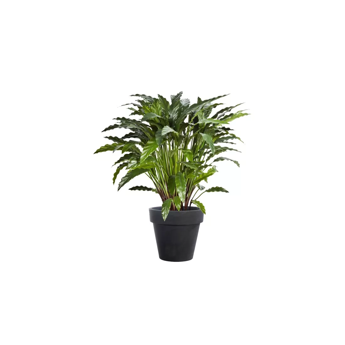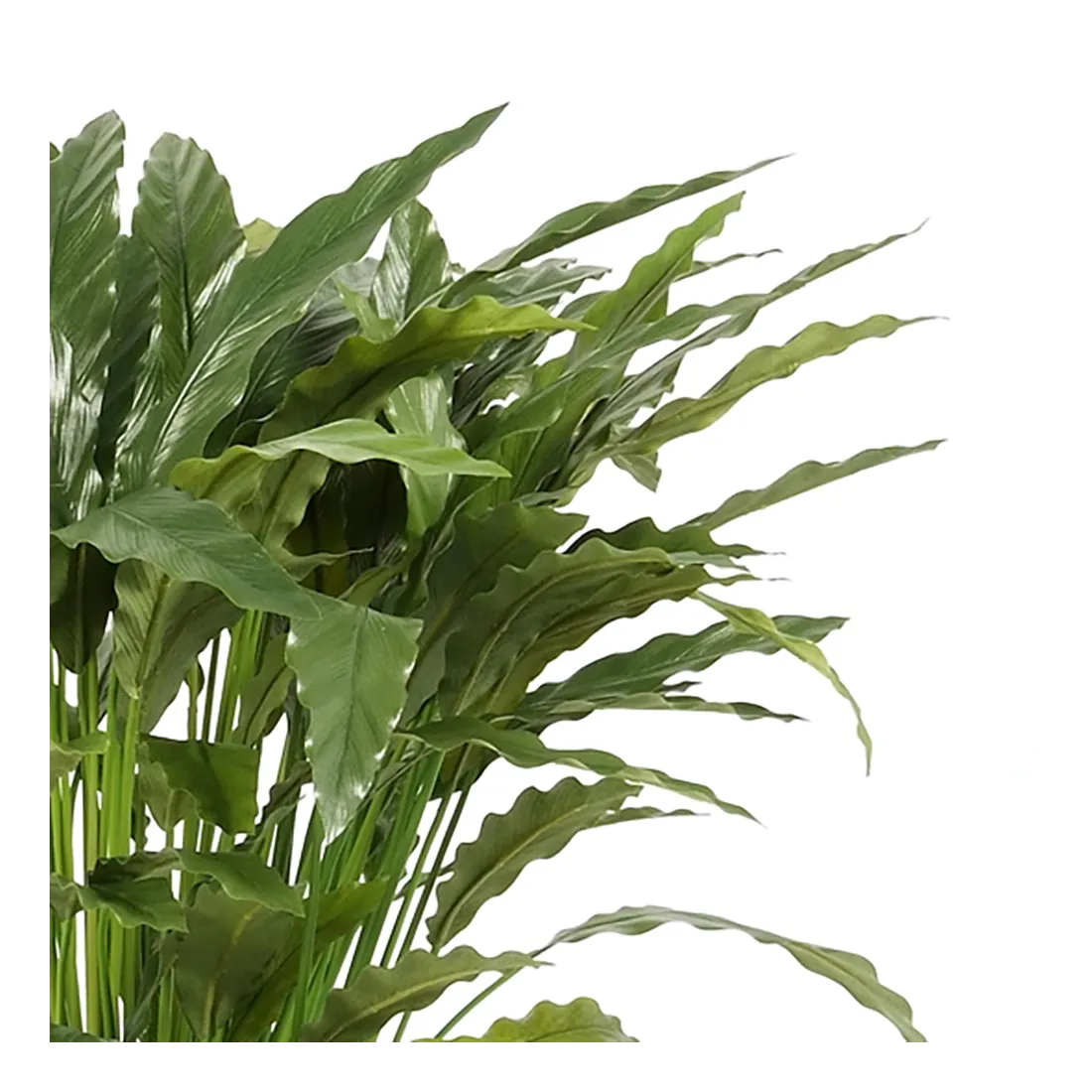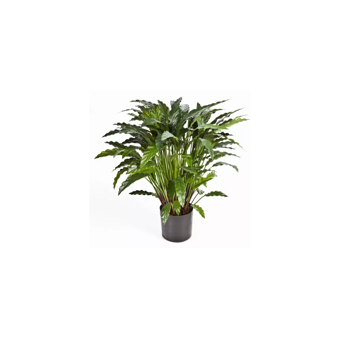 Calathea artificiel décliné en 2 modèles, 84 cm de hauteur et 77 feuilles ou 86 cm de hauteur et 123 feuilles. Composé d’un ensemble dense de belles feuilles synthétiques en tergal (tissu) délicatement ondulées et luisantes de différentes teintes de vert pour simuler une plante en pleine forme. Le feuillage est fixé sur des tiges basales marrons violacés puis vertes comme à l’état naturel. Livré dans un support de calage en plastique, la taille indiquée est comprise de la base du pot jusqu'au sommet du feuillage de la plante.