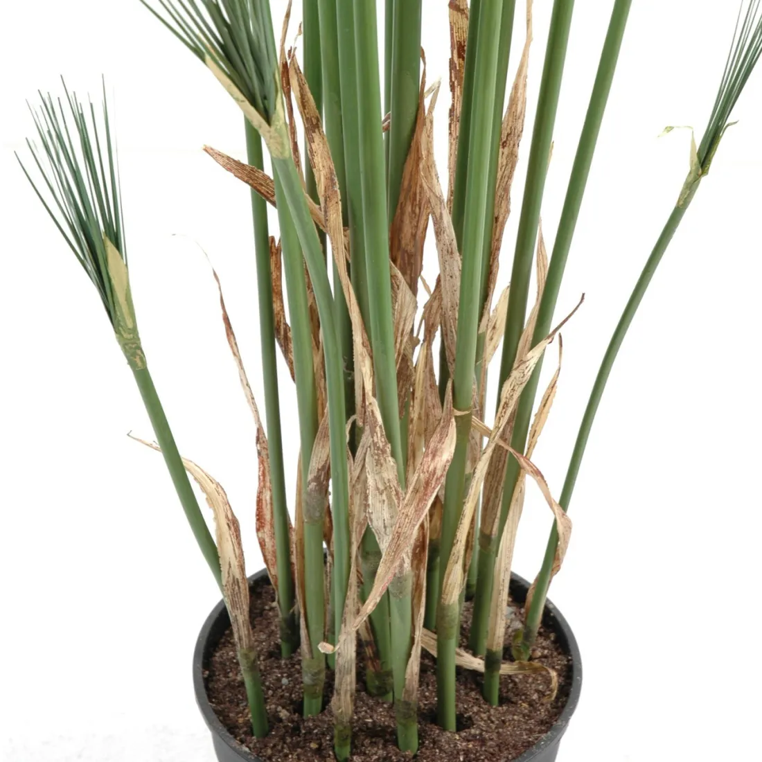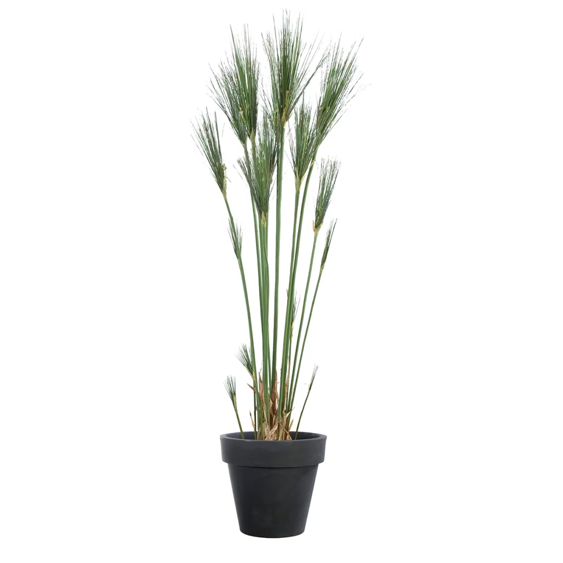 Le papyrus (Cyperus) est originaire d’Égypte. Il est constitué d'une tige ligneuse supportant des feuilles disposées en étoile à son sommet, ses ""fausses feuilles"" disposées en baleines de parapluie. Sa tige en polyuréthane (plastique) armé, c'est à dire qu'une aiguille métallique est introduit dans la tige dans toute la longueur afin de pouvoir lui donner la forme désirée. Cette fausse plante est vendue dans un support plastique lesté (pot PVC noir), la taille indiquée est comprise de la base du pot jusqu'au sommet de la plante.