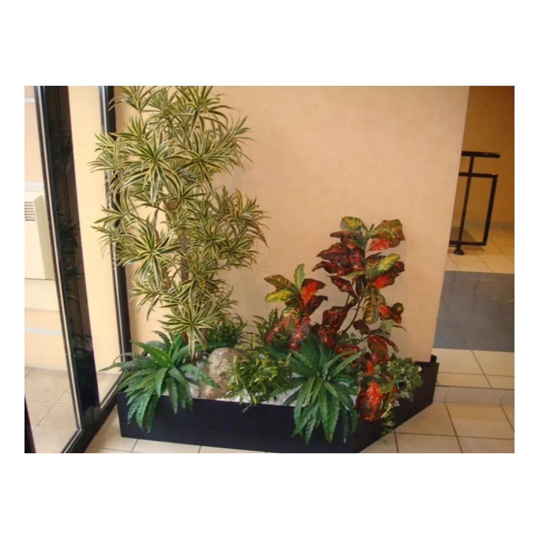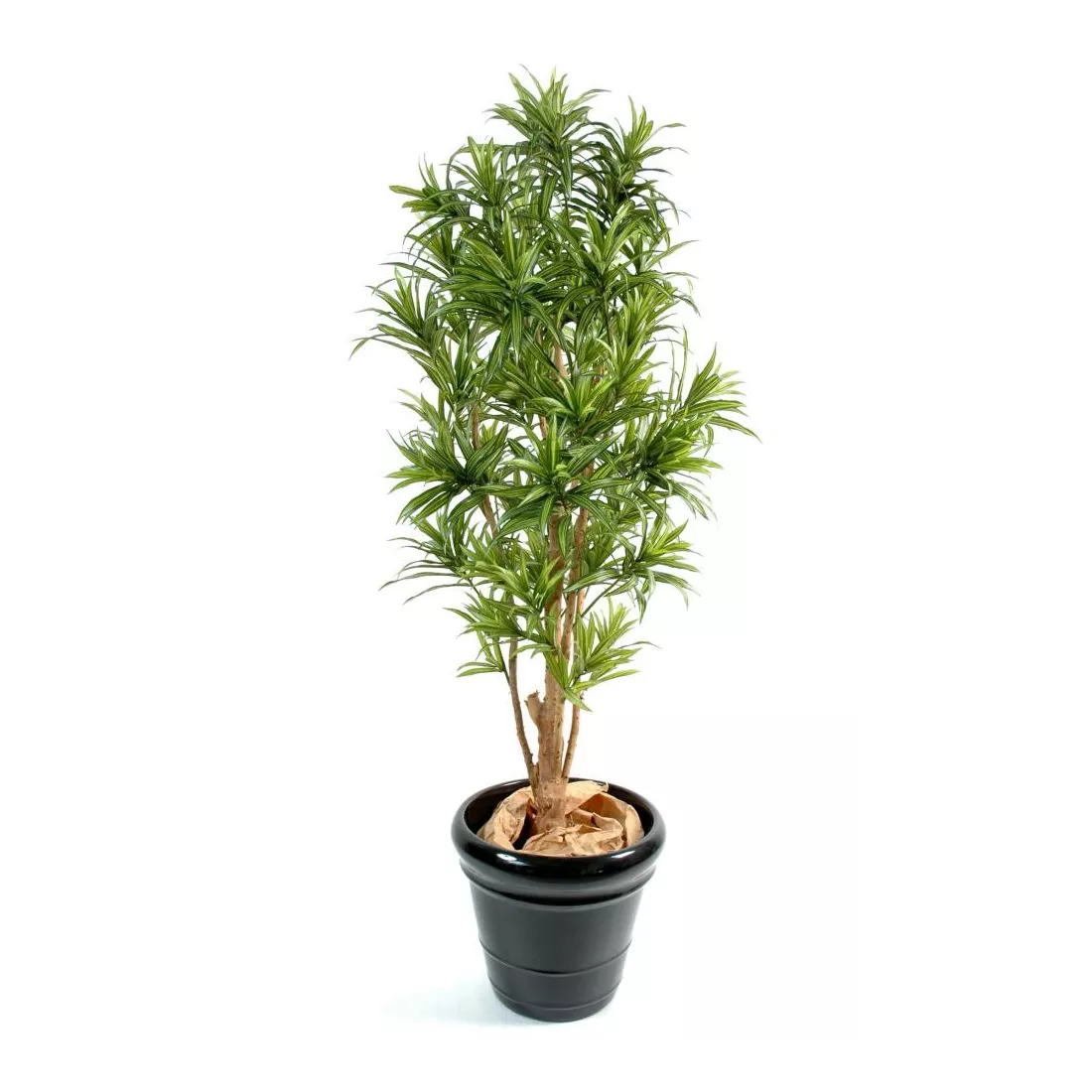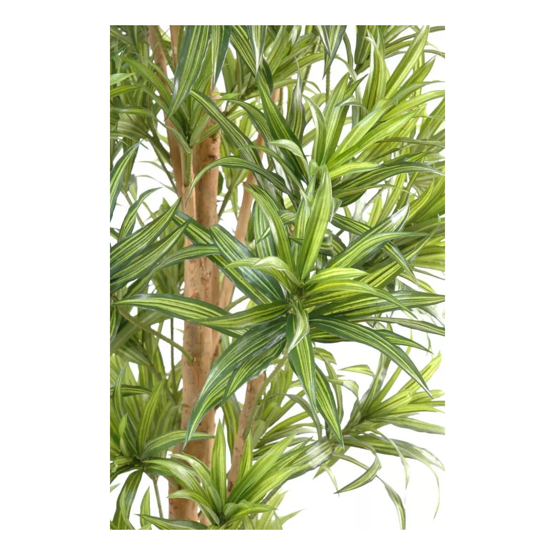 Dracaena artificiel  est composé d'un tronc en bois naturel et d'un feuillage en tergal, soit en vert (deux tons de vert) soit panaché (vert/jaune), décliné en trois dimensions de 110 à 180 cm de hauteur vendu dans un pot PVC basique (support de plantation) plante artificielle