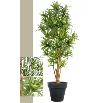 Dracaena artificiel  est composé d'un tronc en bois naturel et d'un feuillage en tergal, soit en vert (deux tons de vert) soit panaché (vert/jaune), décliné en trois dimensions de 110 à 180 cm de hauteur vendu dans un pot PVC basique (support de plantation) plante artificielle