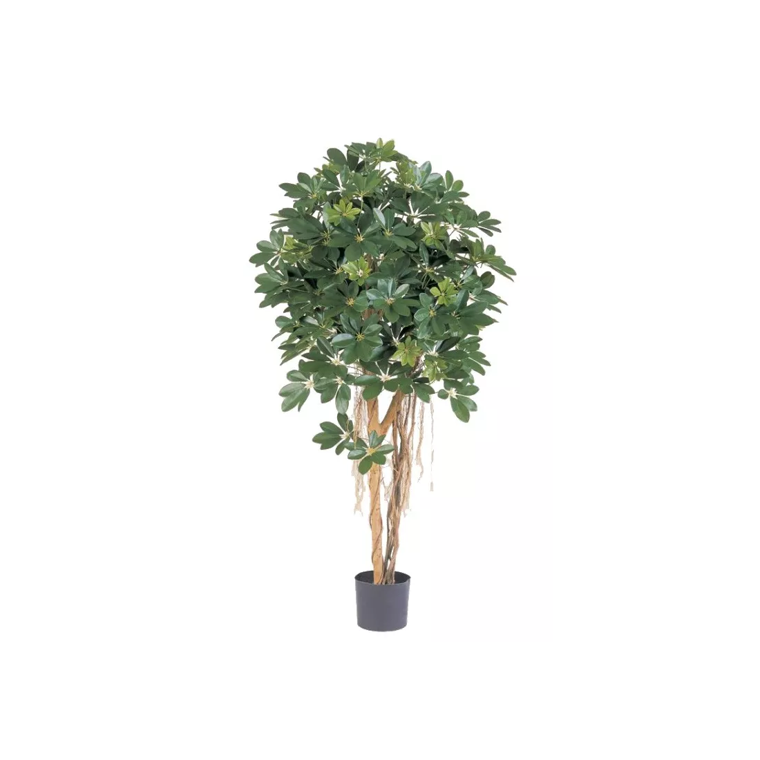 Ce Schefflera artificiel parasol est une très belle réalisation, ce faux arbre tropical amène sa touche d'exotisme, à votre intérieur ses racines aériennes peu vu dans le monde artificiel apporte son originalité. Cet arbre factice disposé dans un pot rond ou carré décorera superbement une entrée, une pièce à vivre, une salle de restaurant... Cette fausse plante par son feuillage vert ou panaché attirera les regards. Associé dans une décoration végétale avec des bambous artificiels ou avec un Beaucarnéa