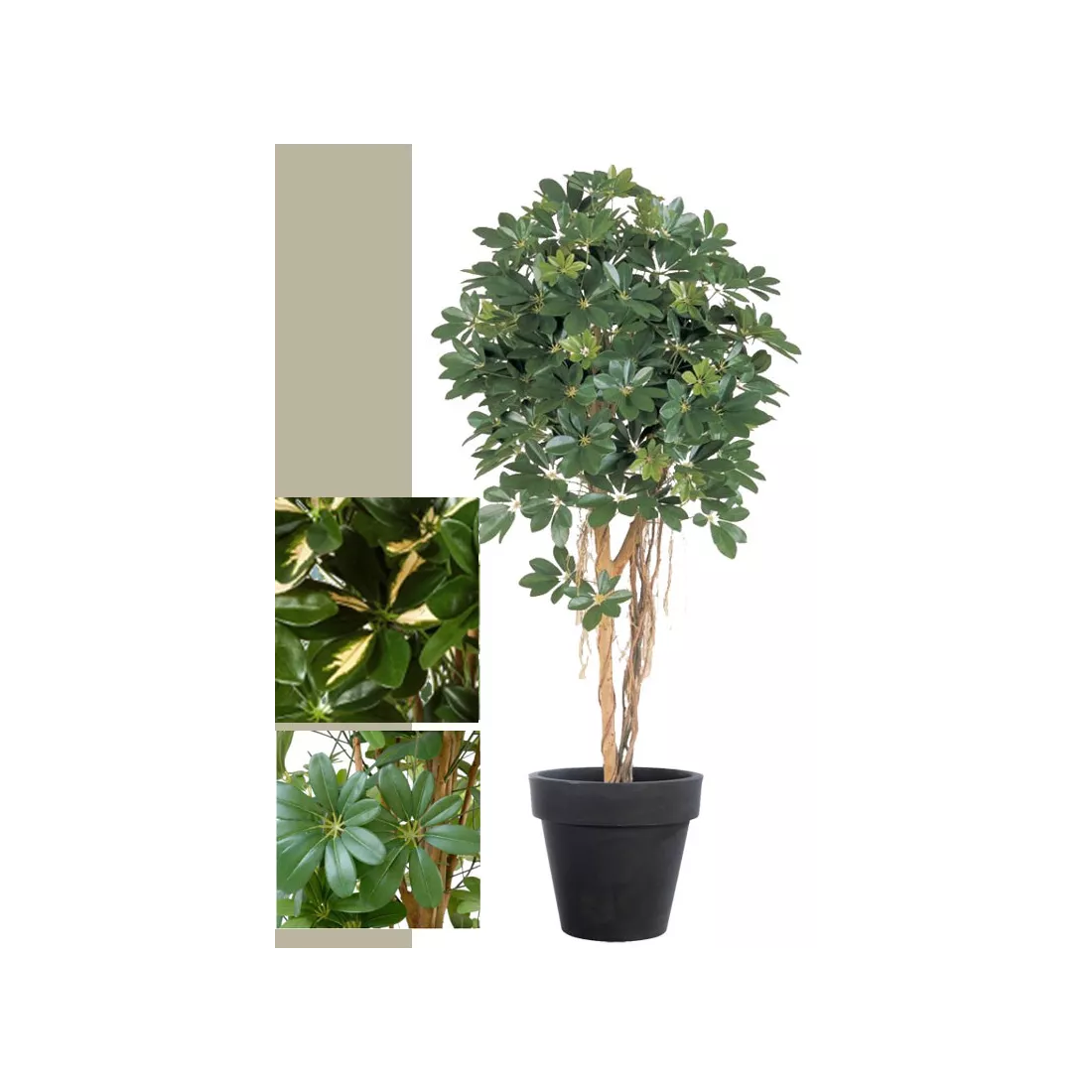 Le Schefflera parasol également nommé arbre-parapluie ou arbre-ombrelle. originaire des zones tempérées chaudes et tropicales. Avec ses racines aériennes, son tronc en bois naturel et son feuillage, cette plante artificielle est une belle copie de la plante naturelle, très décorative. Son feuillage en tissu polyester, Tergal, reproduit la vraie feuille formant un parasol vert ou vert nervuré de crème. Proposé soit en trois dimensions allant du 110 à 170 cm de hauteur. Cet arbre tropical est un arbre artificiel de haute qualité et ne nécessite aucun entretien particulier. C'est une plante les plus utilisée dans le Feng Shui, les feuilles retiennent l’énergie positive et la plante attirerait ainsi bonheur et prospérité pour les occupants de la maison. Cette fausse plante est vendue dans un support de plantation lesté (pot PVC noir), la taille indiquée est comprise de la base du pot jusqu'au sommet de la plante.