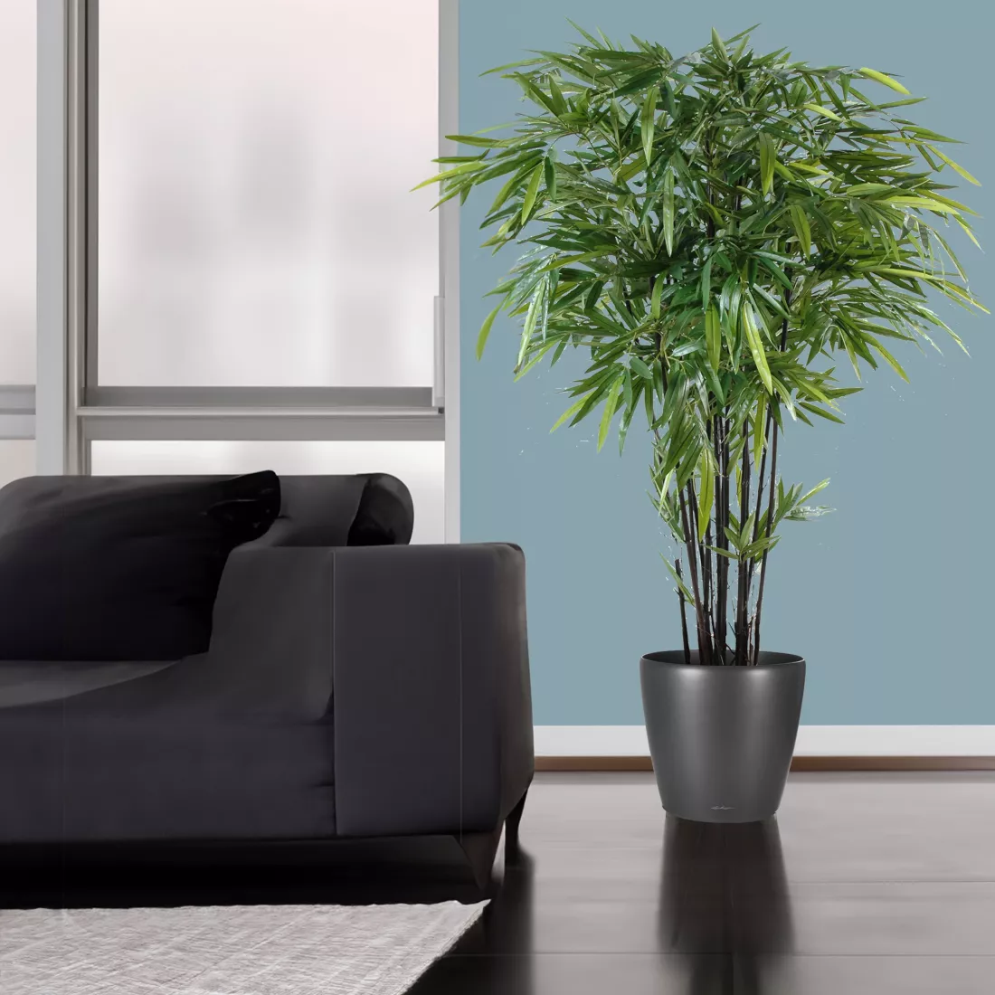 Les feuilles sont déclinées en deux tons de vert. Le rendu haut de gamme est réaliste. Le coloris sombre des chaumes les met joliment en valeur et amène une note moderne à votre intérieur. Le feuillage est buissonnant sur le haut. Pour une répartition des feuilles plus verticale, préférer ce faux bambou black. Installer le faux bambou seul dans un pot carré ou rond, il est magnifique dans un hall ou un salon. Il supporte d'être positionné en hauteur, les cannes noires seront encore plus présentent. Pour la réalisation de bac de plantes ou l'embellissement de stands, le bambou noir synthétique s'accorde avec d'autres arbres comme les palmiers, les ficus, les dracaena artificiels ou les érables.
