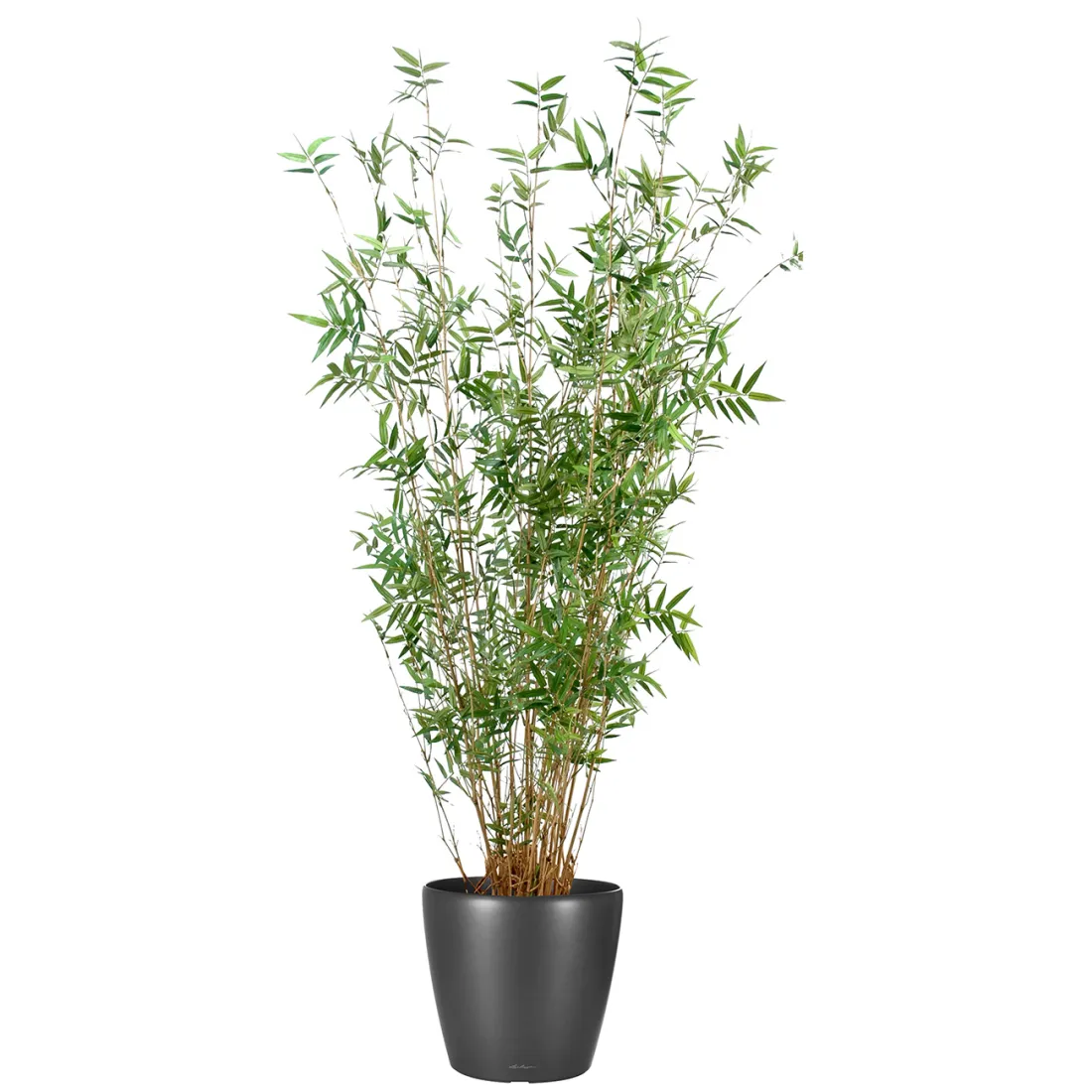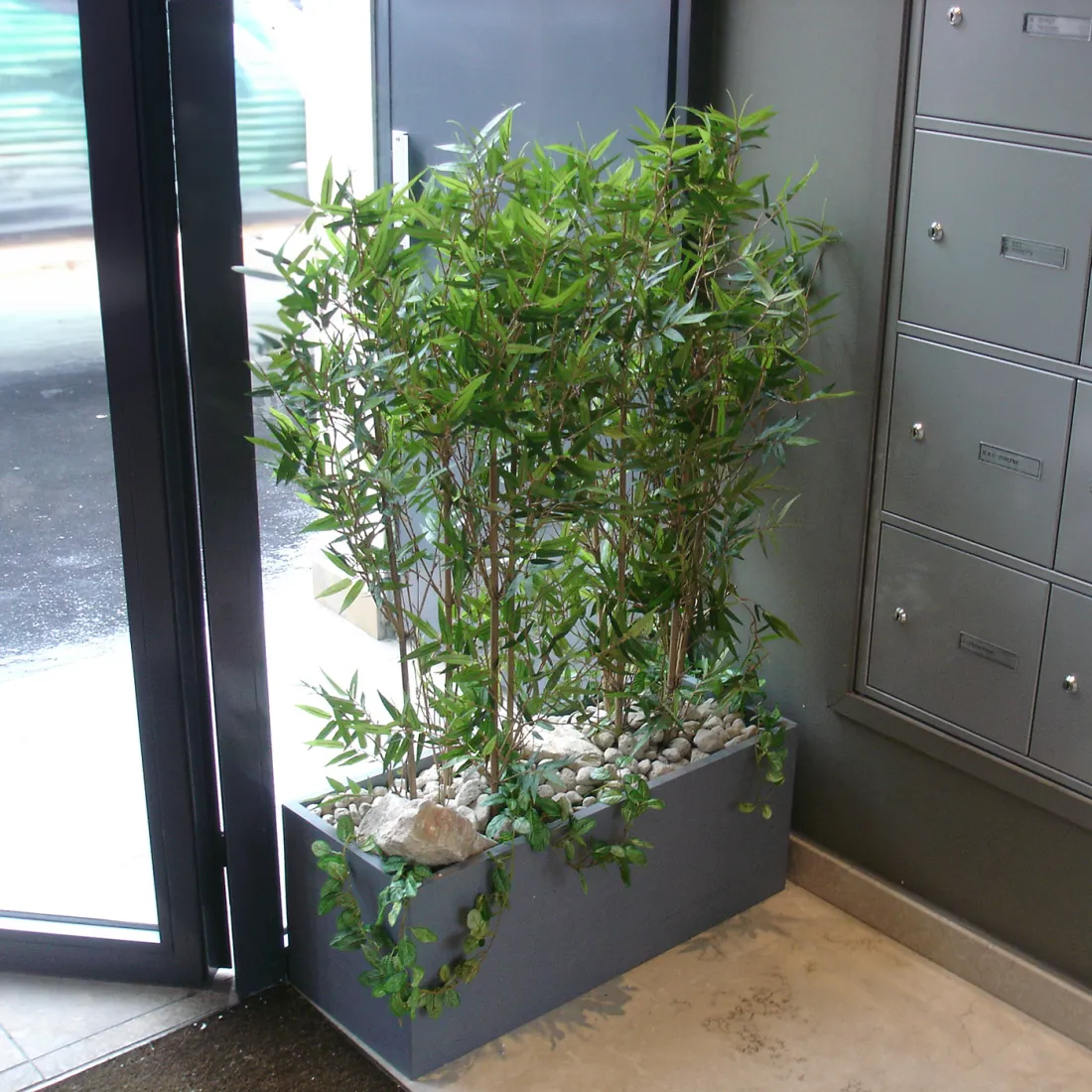 Bambou artificiel à plusieurs tiges fines. Feuillage fixe et léger (plantes artificielles). Un vaste choix de hauteurs est proposé pour cet arbre artificiel, allant de 100 à 220 cm. Livré dans un support plastique esprit conteneur.