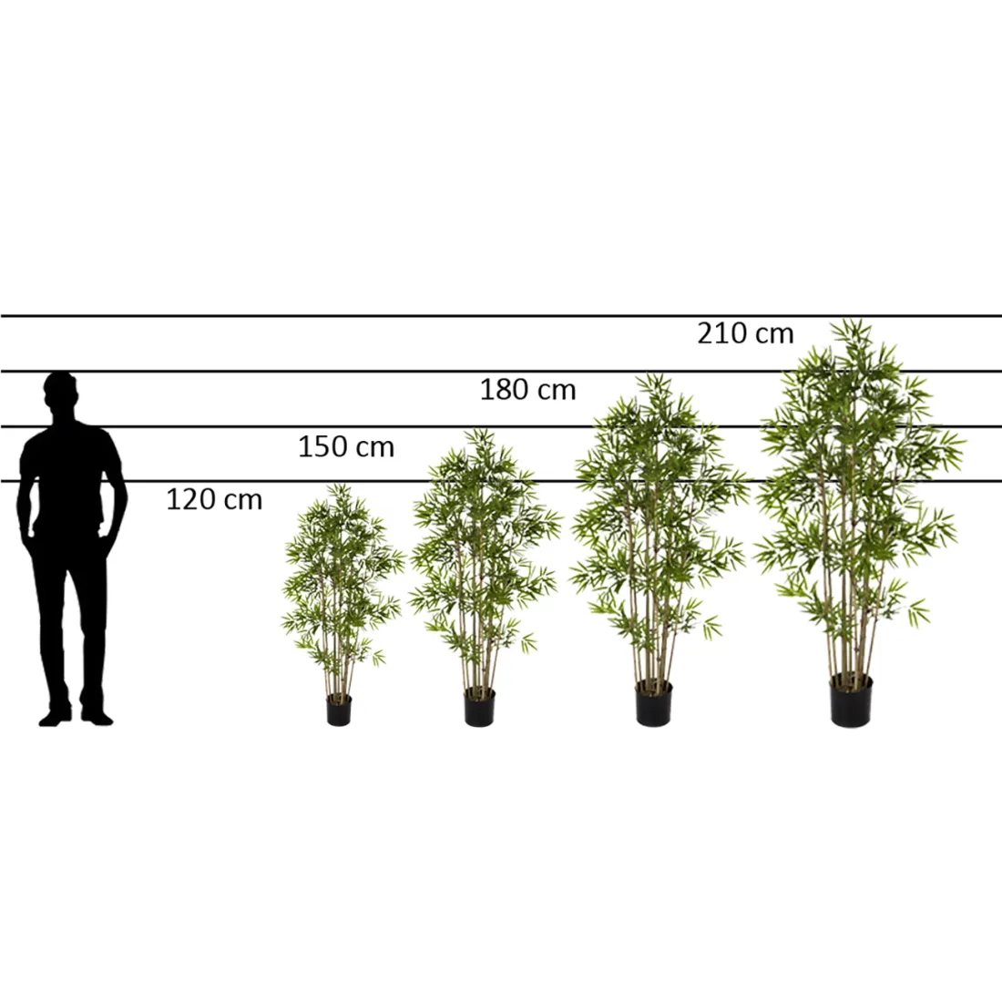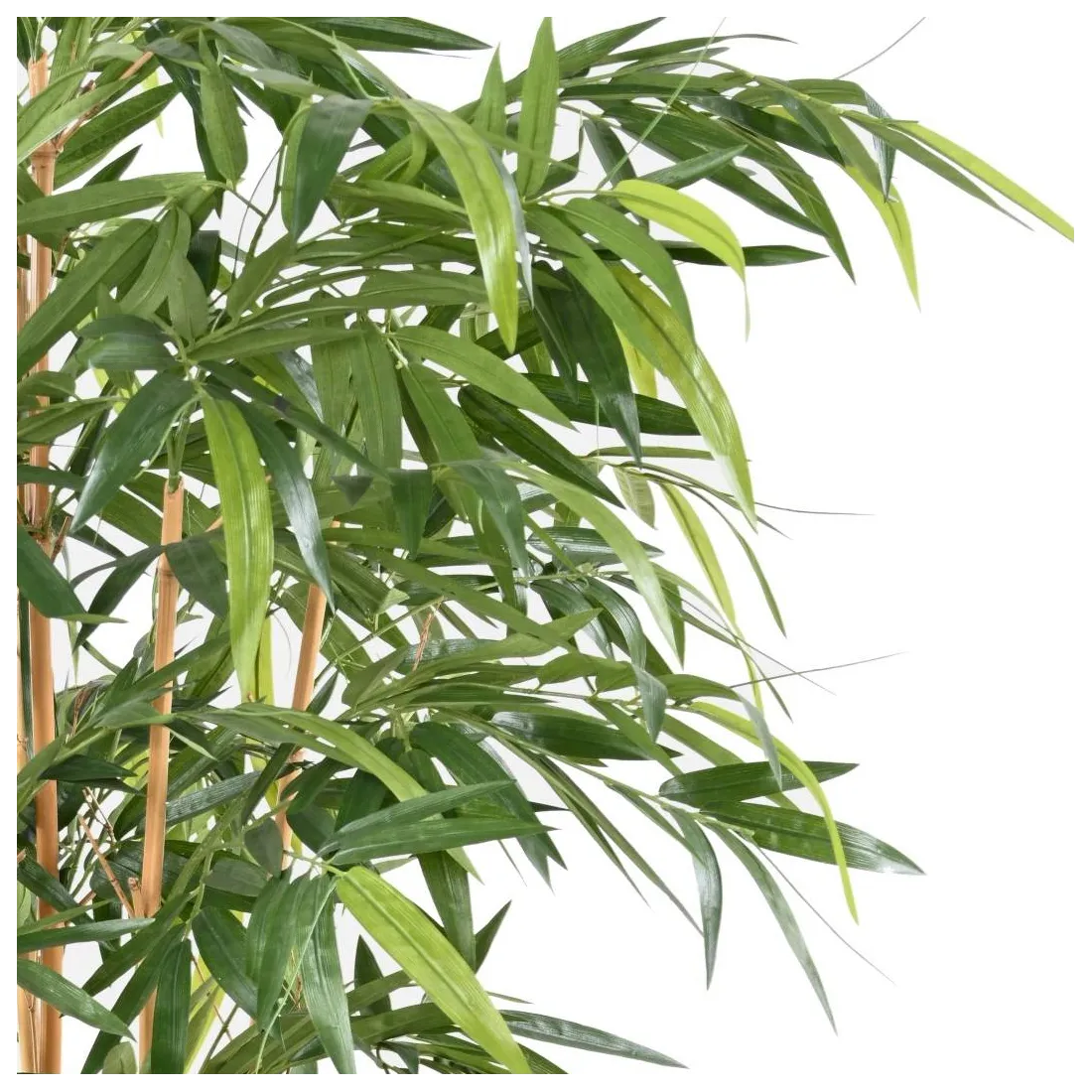 Ce bambou artificiel new est composé de 6 à 9 cannes de bambou naturel (selon la taille) et d'un feuillage vert en tergal de 15 cm de longueur par 2.5 cm de largeur pour les plus grandes. Un vaste choix de déclinaisons est proposé pour cet arbre artificiel, allant de 120 à 300 cm de hauteur. Livré dans un support plastique destiné à être inséré dans un autre contenant plus décoratif (plantes artificielles).