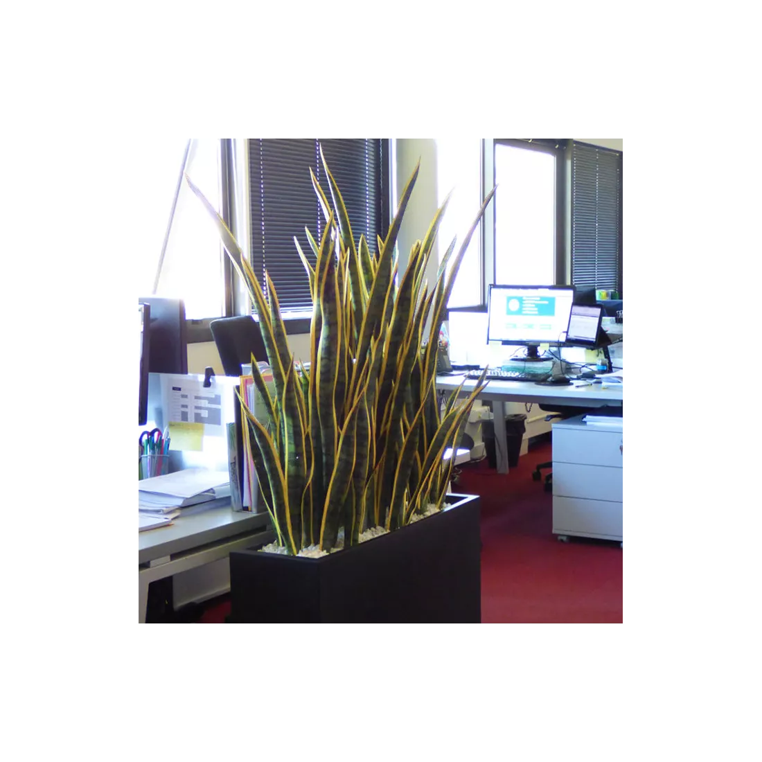 Le sansevieria originaire des régions subtropicales, familièrement appelée Langue de belle mère ou plante serpent. Cette sansevière artificielle est une copie parfaite du sansevieria trifacciata. Elle est composée de 30 feuilles en polyéthylène, matière plastique, mesurant 5 cm au plus large, 9 piquets de feuilles, 2 au centre et 7 autour. La taille est de 110 cm pour 50 cm d'envergure. Ses feuilles rigides verticales sont soit vertes avec des bandes transversales de couleur vert foncé, ou vertes avec une bordure jaune.Cette Sansevieria artificielle superbe réalisation. Livré dans un pot pvc lesté servant de calage dans un cache pot. la taille indiquée est comprise de la base du pot jusqu'au sommet de la plante.