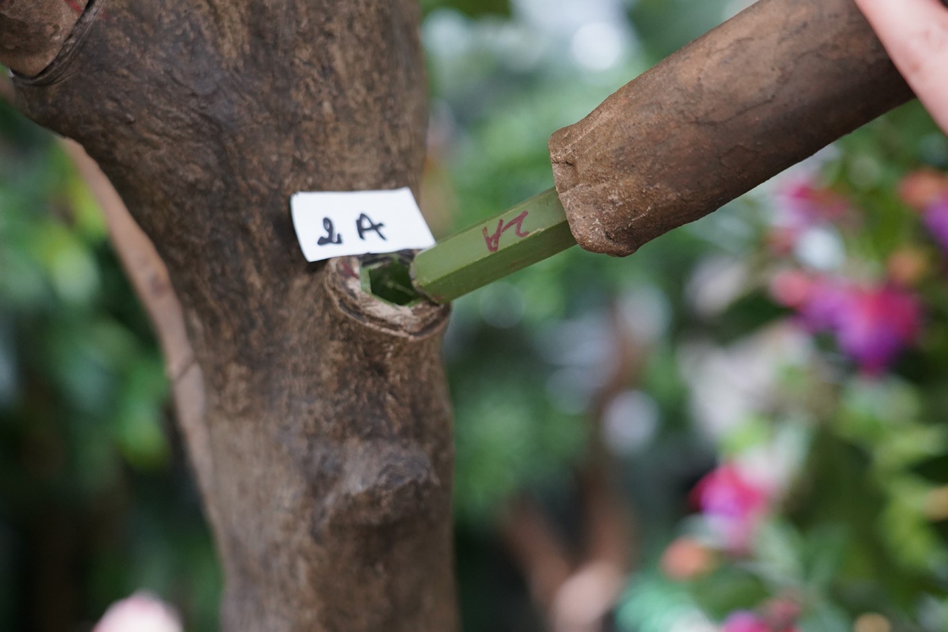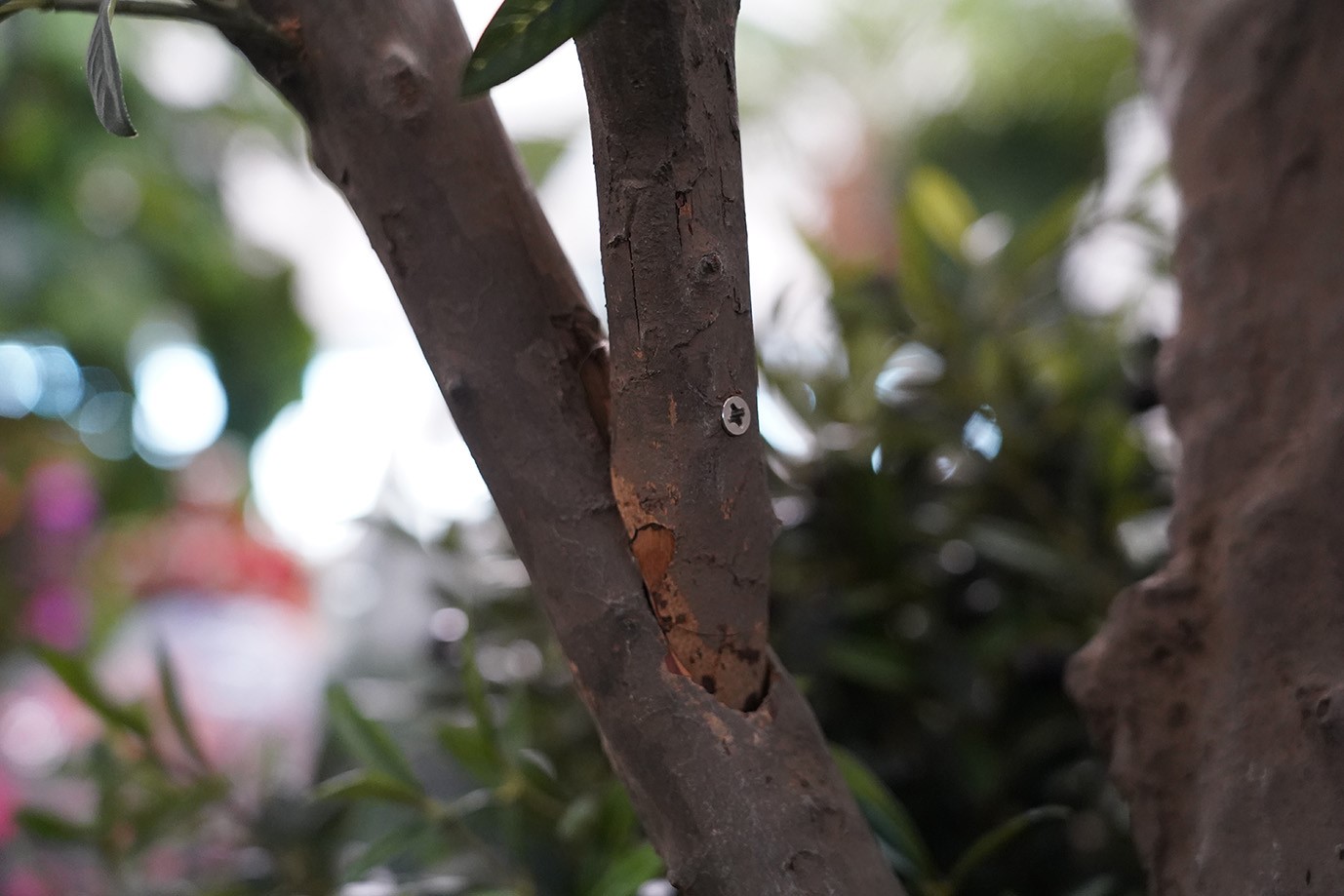 4. Fixez la branche grâce à une vis fournie dans le petit sachet. Aucun obstacle ne doit se trouver dans le trou, la vis doit rentrer facilement. Si ce n’est pas le cas, retirez la branche et replacez-la correctement puis vissez. Il peut y avoir un peu d’espace entre la branche et le tronc. Pas de panique, l’ensemble est réalisé artisanalement à la main, et le montage n’est pas fini.
