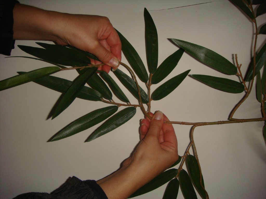 Il est très important de bien ouvrir les tiges feuillues avant de les installer, pour leur donner un mouvement naturel. N’hésitez pas à prendre le temps pour mettre en forme les feuillages, l’esthétique et votre satisfaction en dépendent. Les ramifications sont en tiges armées, vous pouvez donc les manipuler délicatement, tout en faisant attention à rester dans le sens de leur insertion dans la branche afin de ne pas les abîmer.