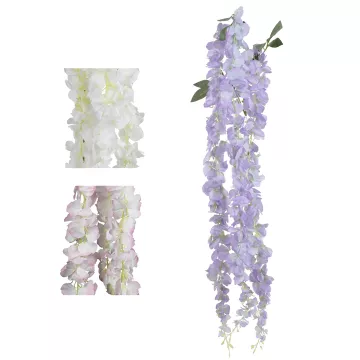 Tige fleurie de 90 cm Couleur lavande ou blanc rosé, composée de 3 chutes de glycine artificielle de 84 cm de longueur, fixées sur une tige armée de 68 cm.