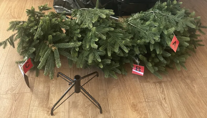 1- Commencez par sortir tous les éléments du sapin de l’emballage. Le nombre de pièces peut varier de 3 à 5 en fonction de la hauteur de l’arbre.