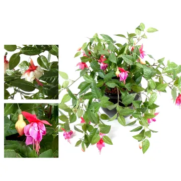 Fuchsia artificiel mesurant 40 cm de longueur et d’environ 35 cm d’envergure, disponible en 2 coloris bicolores : rose fushia/violet, ou blanc crème/rouge. Un feuillage synthétique constitué d’environ 300 feuilles artificielles en tergal (tissu) délicatement nervurées et d’élégantes fleurs artificielles haut de gamme bicolores (ouvertes ou à l’état de bourgeons). L’ensemble est fixé sur des branches métalliques de longueurs variables recouvertes de plastique marron/vert pour adapter sa forme à votre créativité. Cette fausse chute de fuchsia très réaliste munie d’un piquet (carotte) d’environ 11 cm en métal recouvert de plastique est à piquer (vendue sans pot).