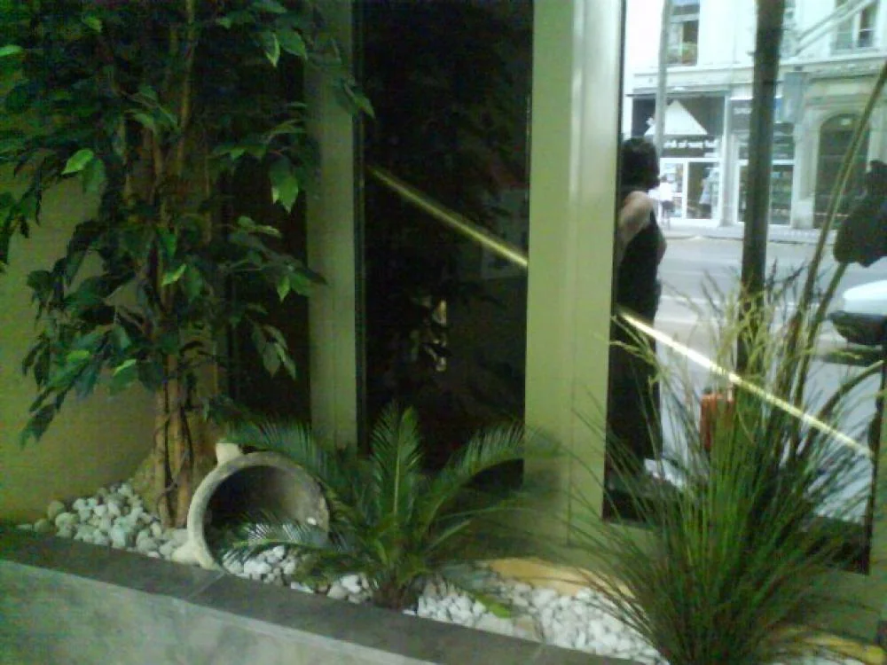 Hall d'entrée d'immeuble sur la région de Lyon Une plante artificielle, un arbre semi-naturel et plante chute suffisent pour décorer toute une entrée et donner une ambiance chaleureuse.