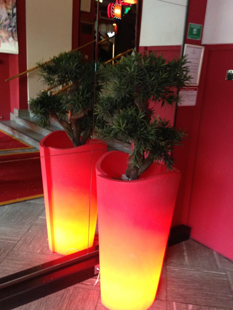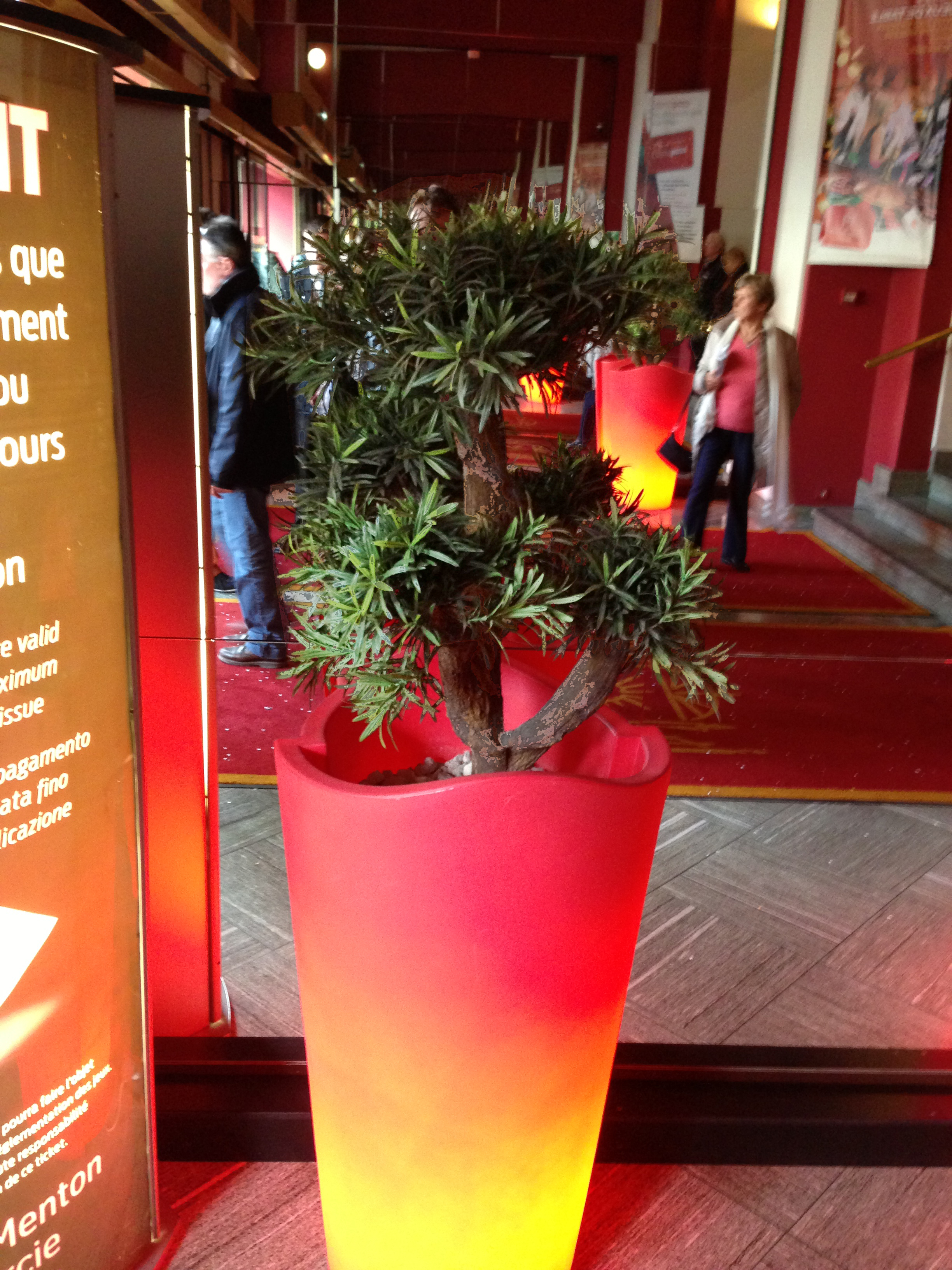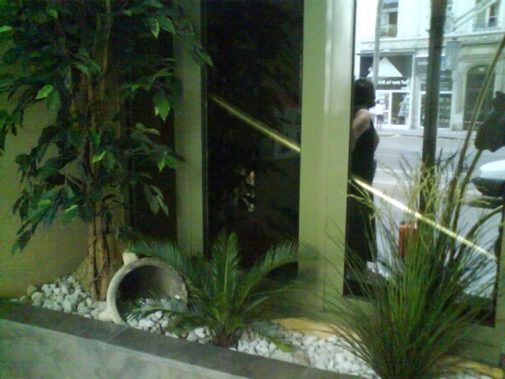 Hall sur les quai de Saone ( Lyon), des palmiers de plus de 3 mètres, des bambous, et autres arbres et plantes artificielles exotiques donnent à cette entrée une touche originale.