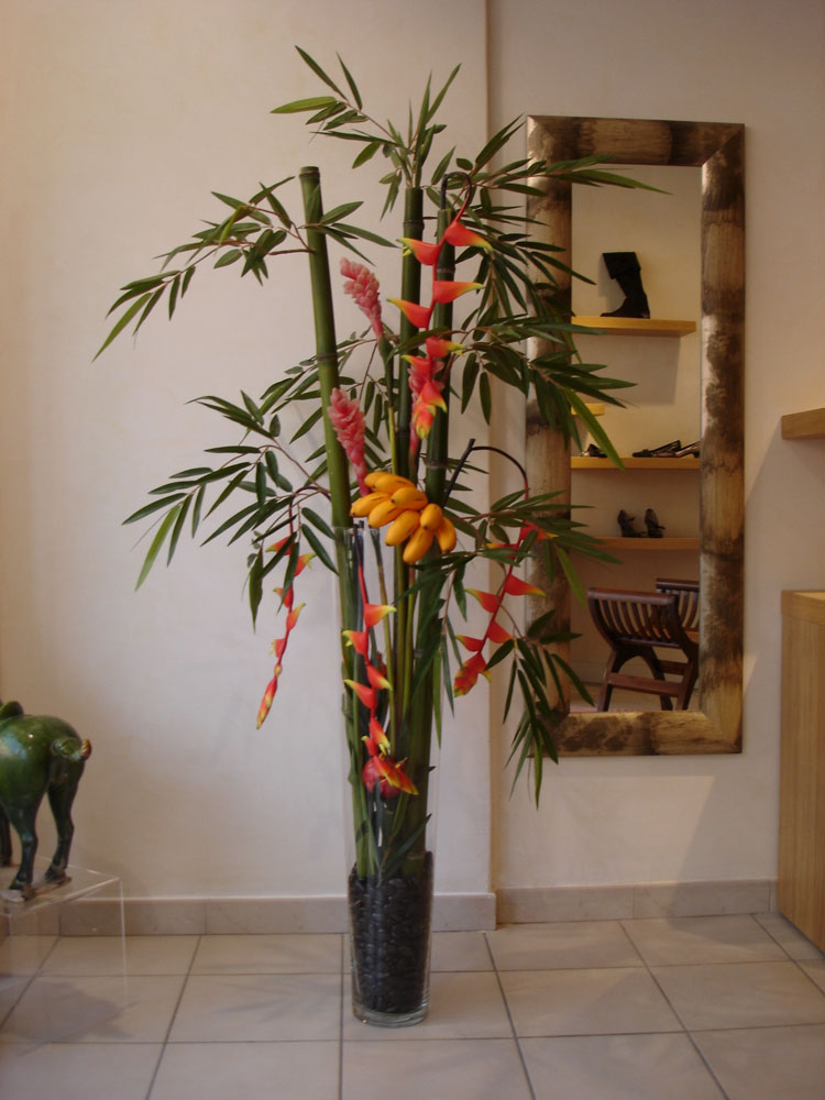 composition du bac : 1 Bambou artificiel bouddha 210 ( Arbre semi-naturel ), 1 Anthurium jungle 80 cm (plante artificielle), 1 Herbe de rivière 100 cm (plante artificielle), 1 Plante rampante. - Hall d'entrée Sainte-Foy- lès Lyon (région de Lyon) plantes artificielles