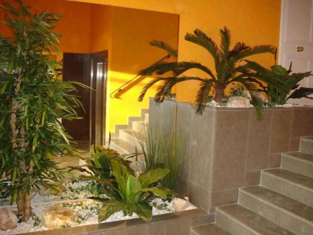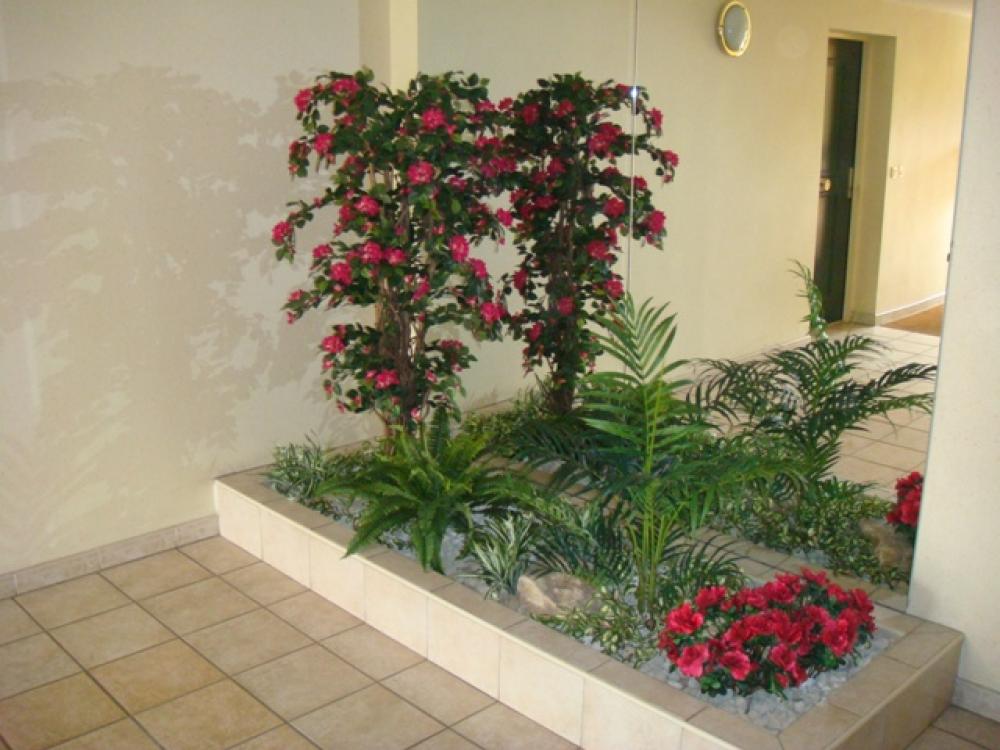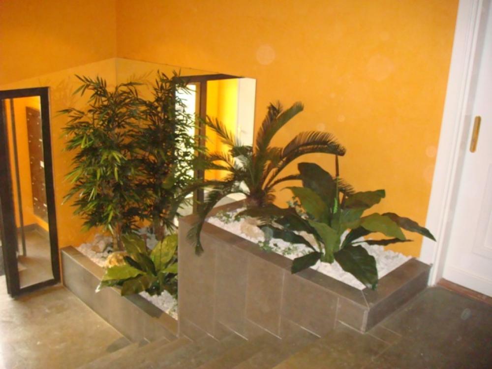 Hall d'entrée d'immeuble sur Craponne (région de Lyon ) Peu de plantes artificielles,d'arbres semi-naturels et plantes chutes suffisent pour décorer toute une entrée et donner une ambiance chaleureuse.