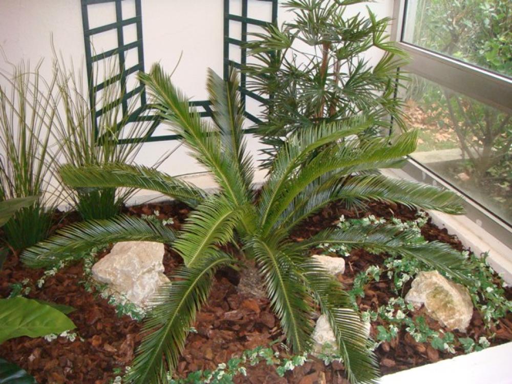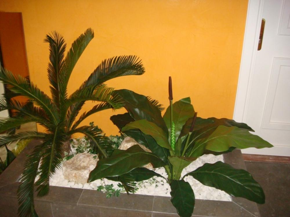 composition du bac : 1 bambou 180 cm ( arbre semi-naturel ), 1 cyccas 65 cm( plante artificielle ), 1 plante rampante. - Hall d'entrée Immeuble sur Grézieu la Varenne (région de Lyon) plantes artificielles