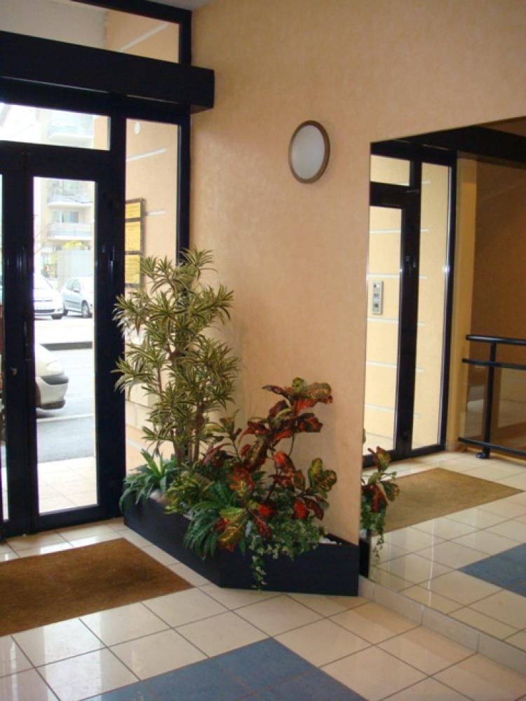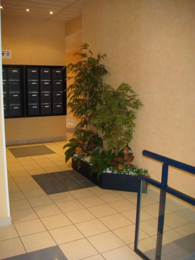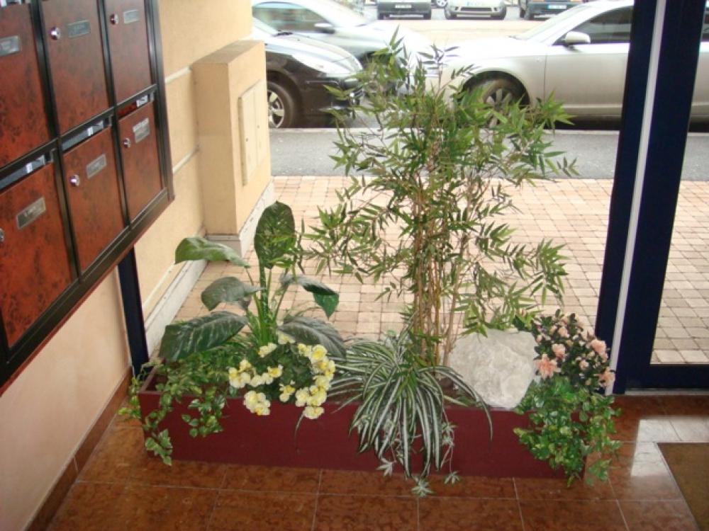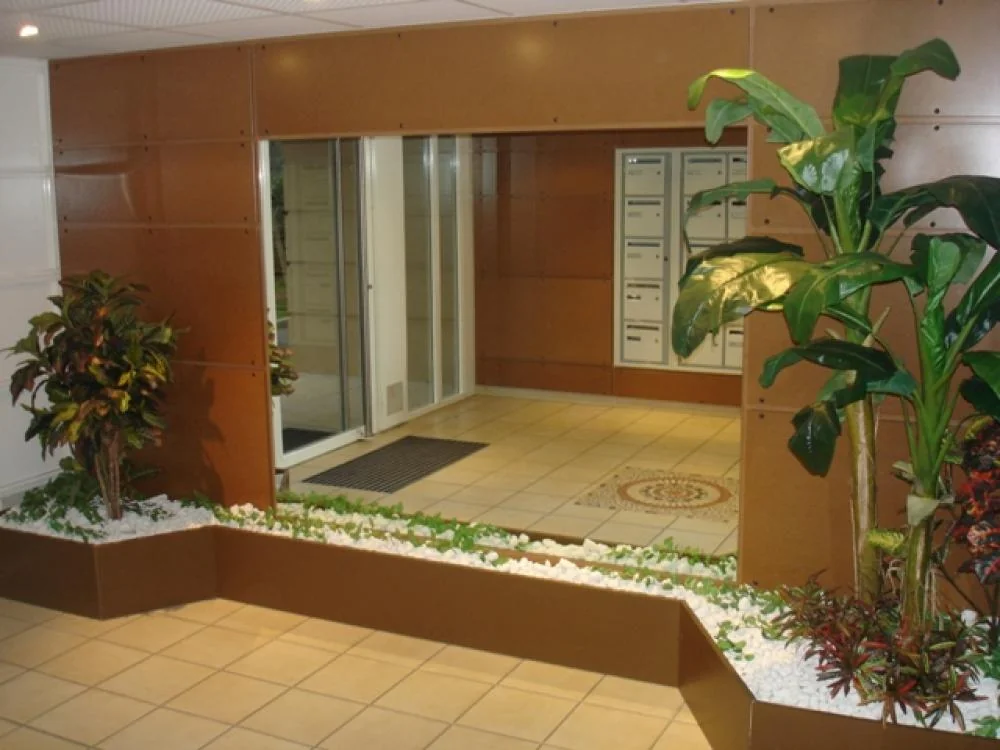 Hall d'entrée d'immeuble sur la région de Lyon Une plante artificielle, un arbre semi-naturel et plante chute suffisent pour décorer toute une entrée et donner une ambiance chaleureuse.