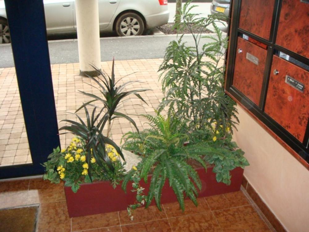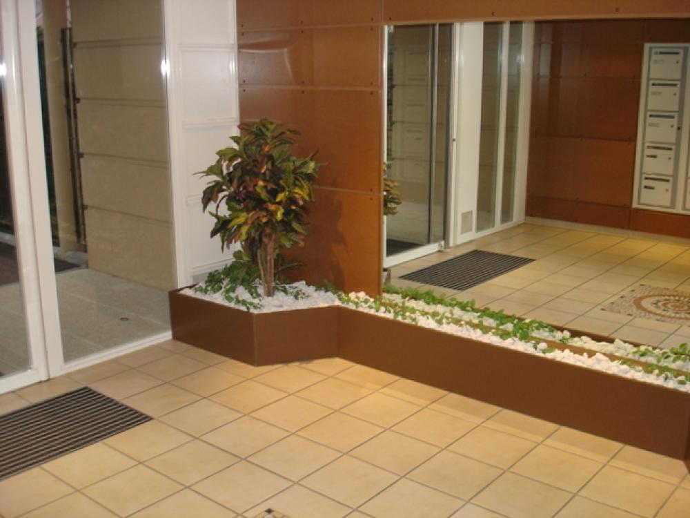 2 bacs réalisés sur Craponne (région de Lyon ) pour un hall d'immeuble, création dss bacs aux couleurs des boiseries de l'entrée, pour mettre en valeur les plantes artificielles et donner une ambiance chaleureuse.