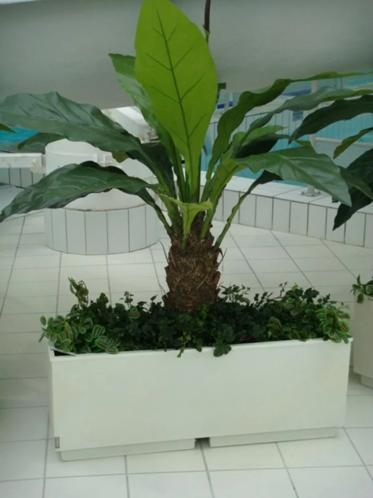 composition du bac : 1 Bananier artificiel 1m80 ( plante artificielle ), 1 Bananier 1m50 ( plante artificielle ), 1 Croton multicolor ( plante artificielle ), 2 Croton PM touffe colorés( plantes artificielles ), 2 Plantes vertes rampantes - centre nautique communauté de communes (région de Lyon ) plantes artificielles