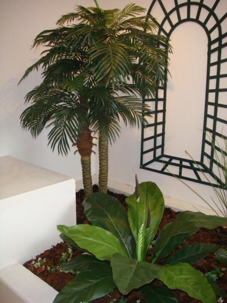 composition du bac : 1 Palmier artificiel double 210 cm (plante artificielle), 1 Livistonia 140 cm (plante artificielle), 1 Cycas 100cm géant (plante artificielle), 1 Anthurium jungle 80 cm (plante artificielle), 2 Herbe de rivière 120 cm (plantes artificielles), 2 Plantes vertes rampantes. - Mur végétal artificiel