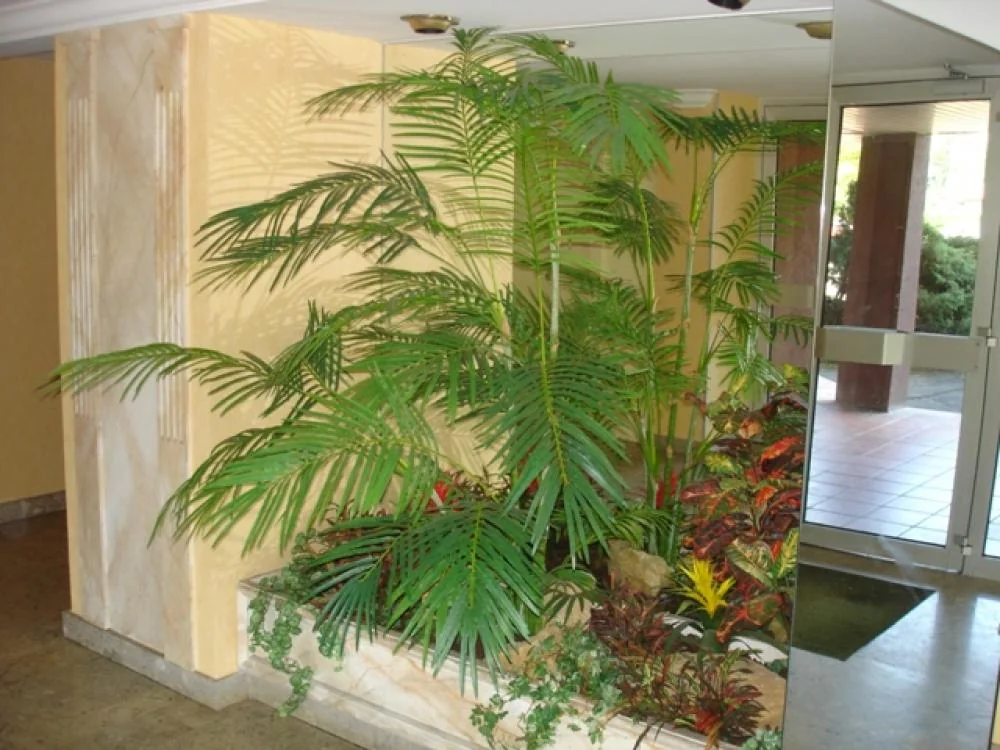 composition du bac : 2 Palmiers artificiels Areca 3m00 ( Plantes artificielles ), 2 Bambous artificiels 1m80 ( arbres semi-naturels ),Diverses Plantes artificielles (fougère diam.85, croton coloré, plantes rampantes style lierre, pothos jaune/vert, ...) - Hall d'entrée d'immeuble sur Craponne (région de Lyon ) plantes artificielles