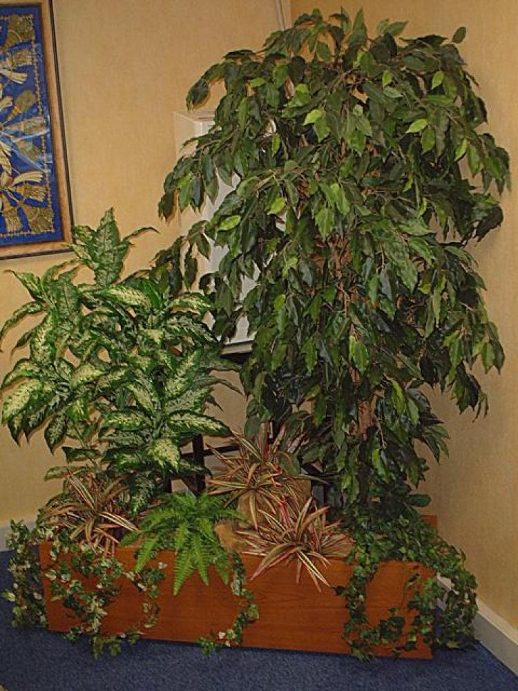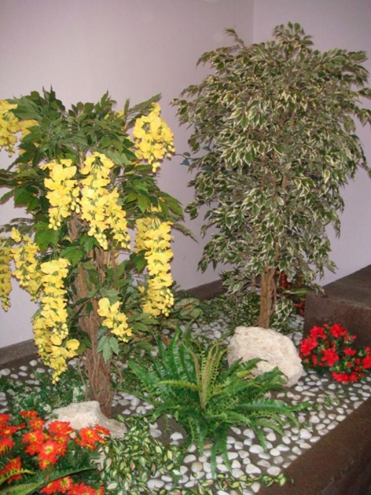 composition bac (photo 3):Glycine jaune Ficus vert/ blc ( arbre semi-naturel ), 3 Plantes fleuris ( plantes artificielles ) , 1 Fougère ( plantes artificielles ), Plantes vertes rampantes
